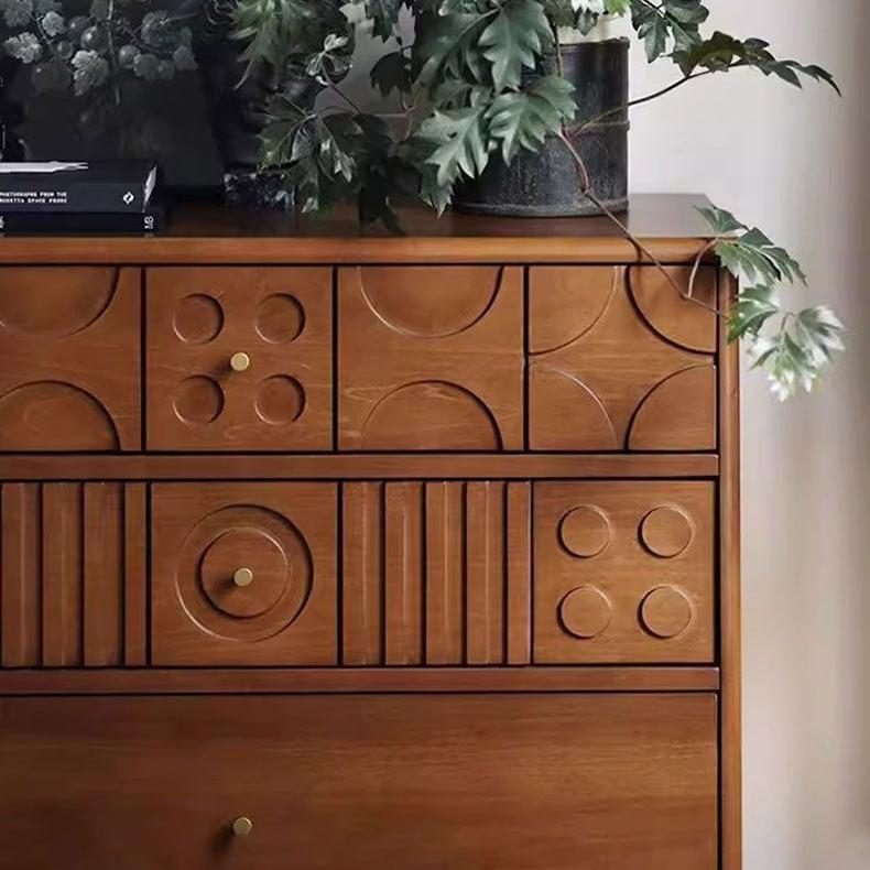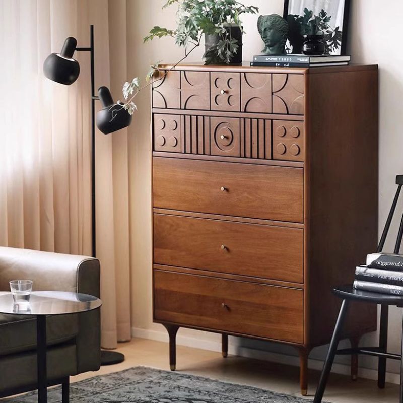 特點:選用北美進口黄杨木為材。這款復古風格五斗櫃融合了精美的幾何圖騰雕刻,展現出獨特的藝術氣息。櫃體設計堅固耐用,配有可調節腳墊,適應不同地面高度,確保使用穩定。無論是收納還是裝飾,這款五斗櫃都是理想之選。