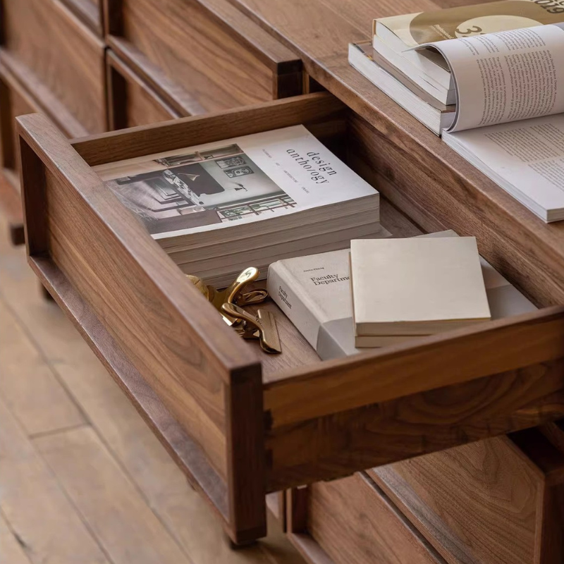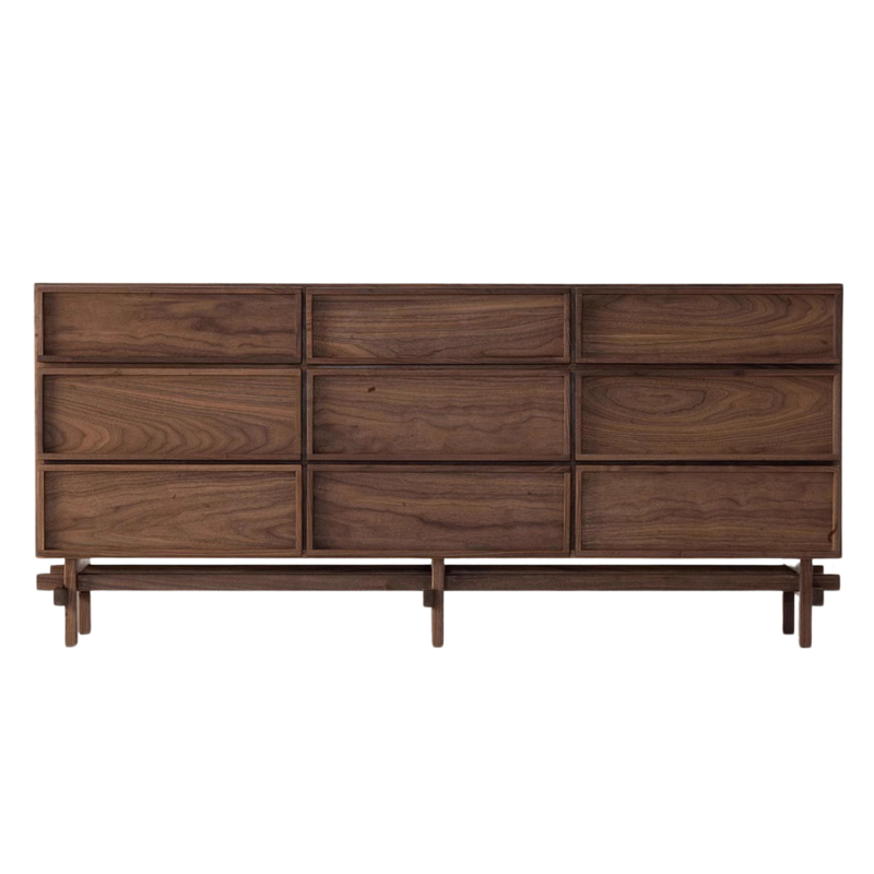 特點:選用北美進口黑胡桃木為材。這九斗櫃是以黑胡桃木製成,擁有豐富的木紋質感。實用的抽屜提供充足的收納空間,同時展現出簡約優雅的設計風格。這組櫃子為您的室內空間帶來了高品質和時尚的儲物解決方案。