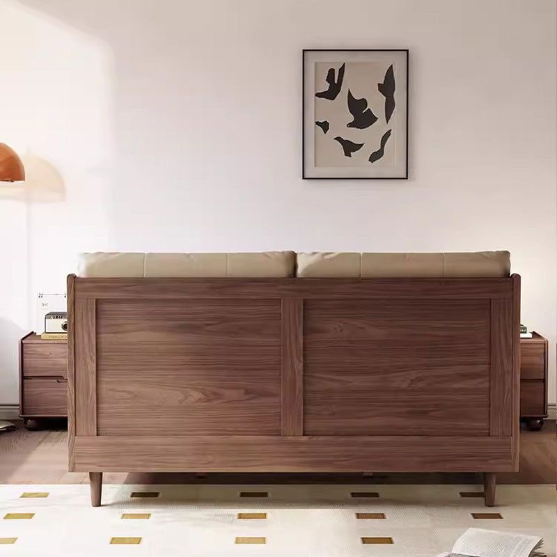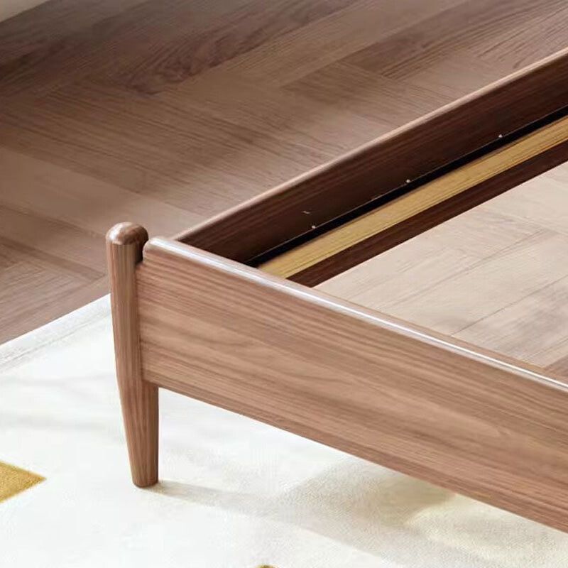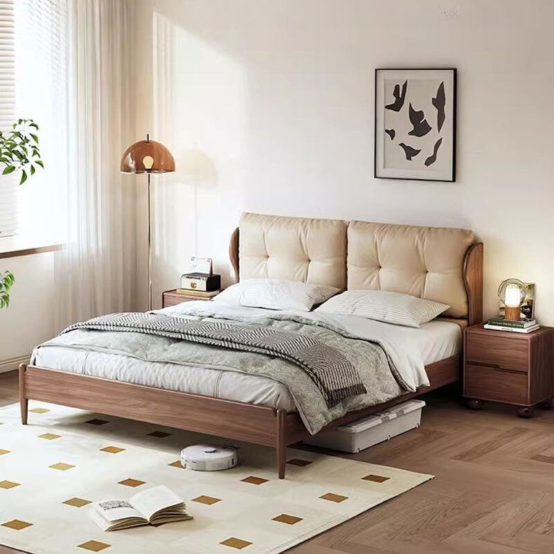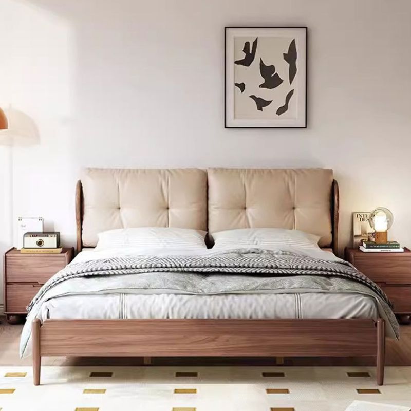 Features: Made of black walnut imported from North America. This upholstered double bed offers ultimate comfort and support, perfect for long, deep sleep. Its soft headboard provides a comfortable recline, while the spacious bed surface is perfect for two people sharing. Its sturdy frame ensures durability, while its modern, minimalist design blends seamlessly into any home, adding a warm touch.