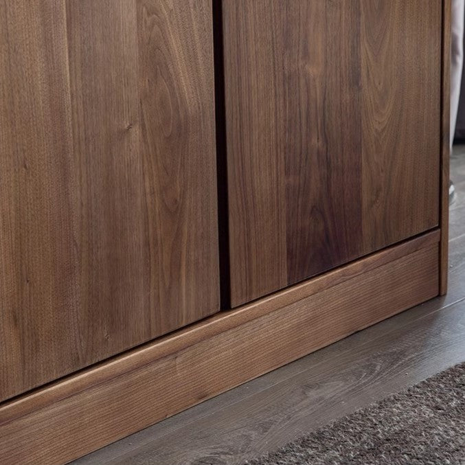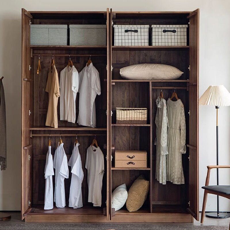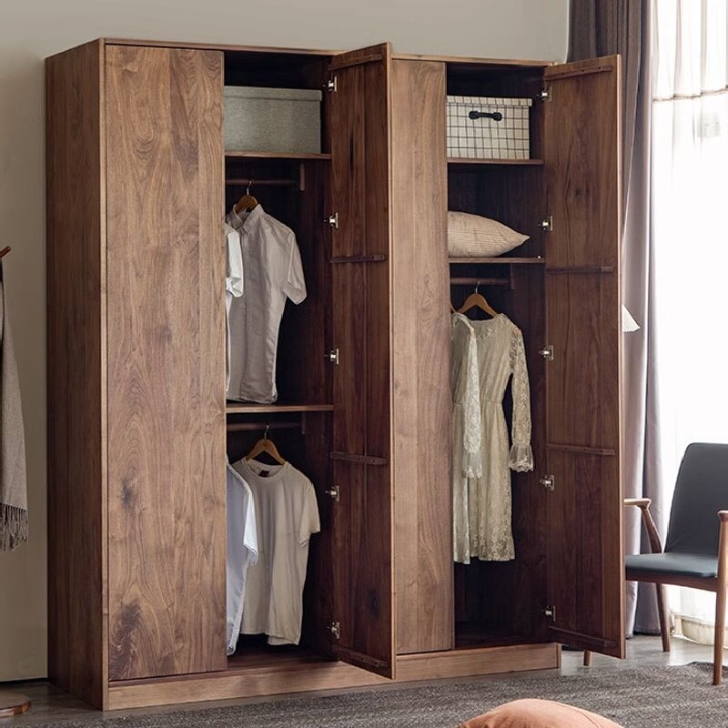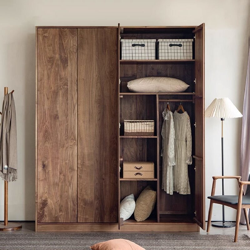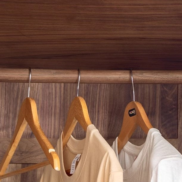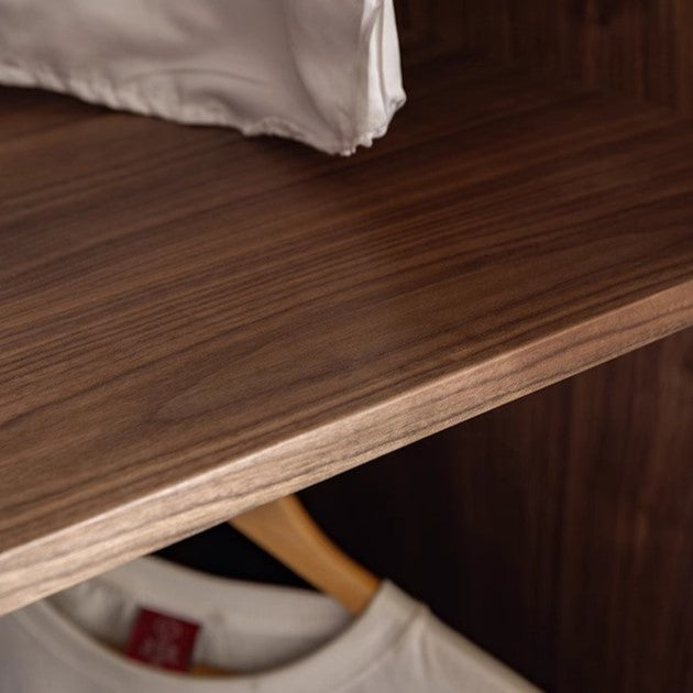Features: Crafted from imported North American black walnut, this sophisticated wardrobe features concealed handles, adding a clean, modern touch to your bedroom. The removable clothes rail allows for flexible storage, perfect for hanging long or short garments. Its perfect combination of practicality and stylish design makes it perfect for those who value efficiency and aesthetics.