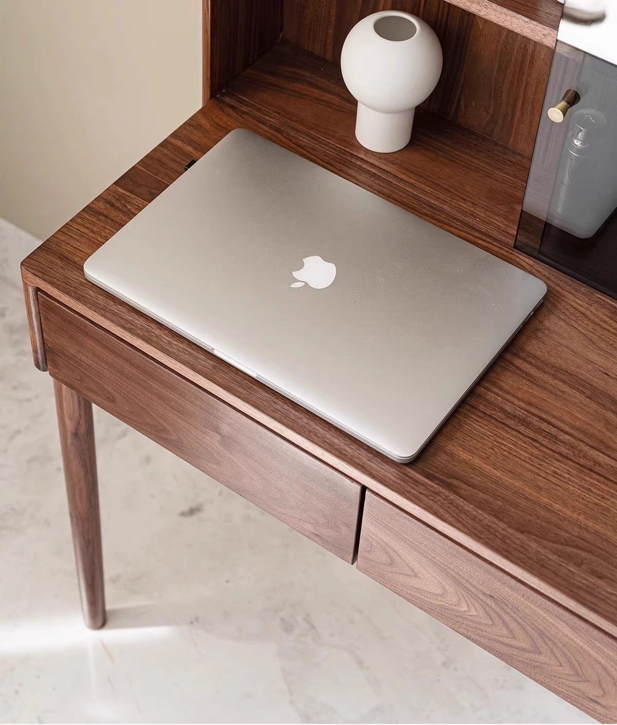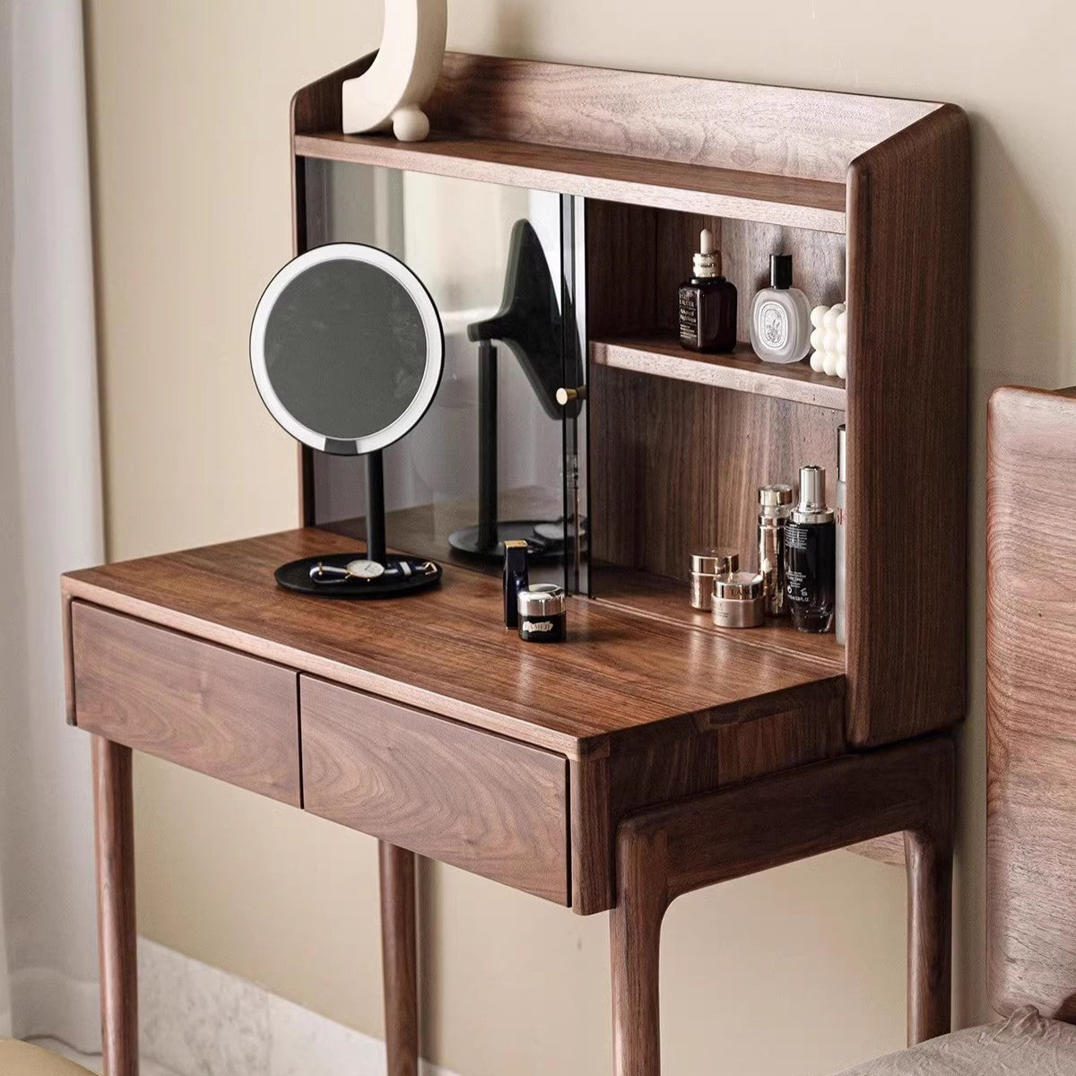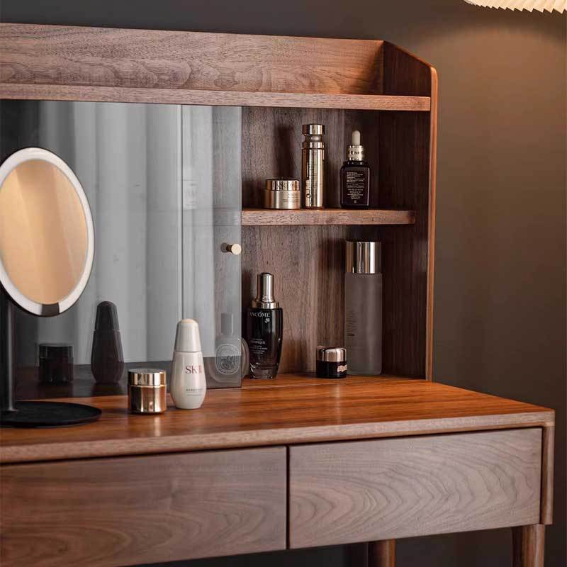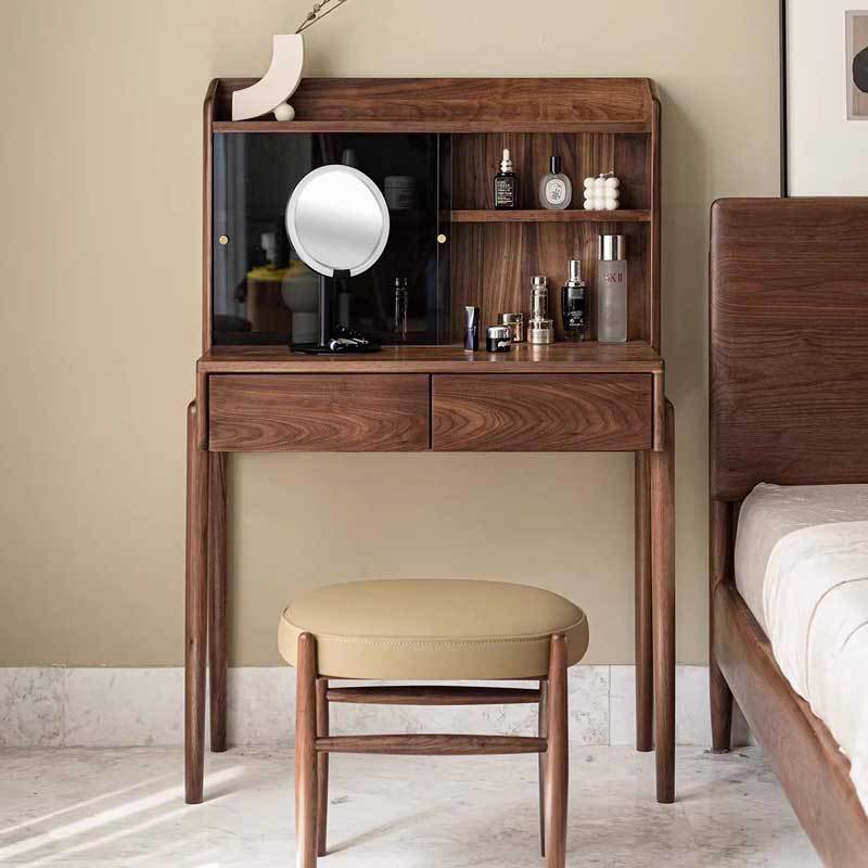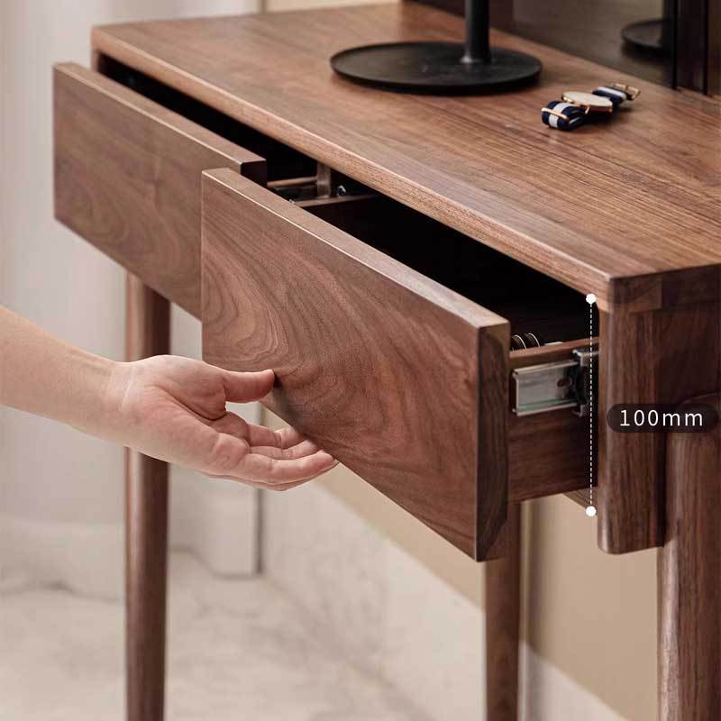 Features: Crafted from imported North American black walnut, this black walnut dressing table combines modern and classic styles. The meticulously crafted wooden top displays a deep hue and unique wood grain, providing a comfortable space for makeup and organization. The cleverly designed drawers and cabinets offer convenient storage while adding elegance and functionality to any room.