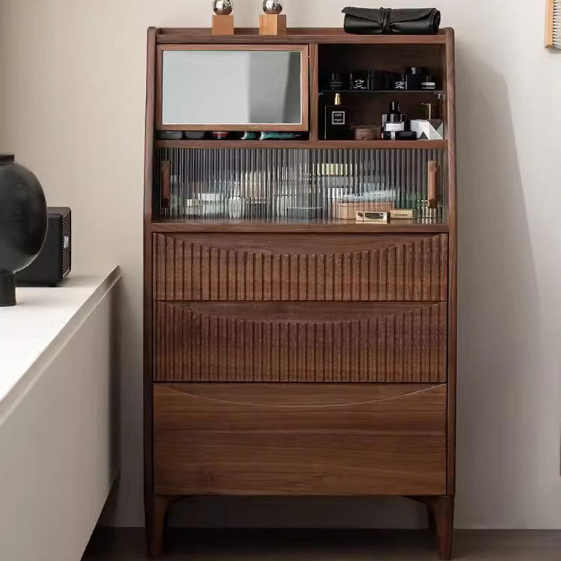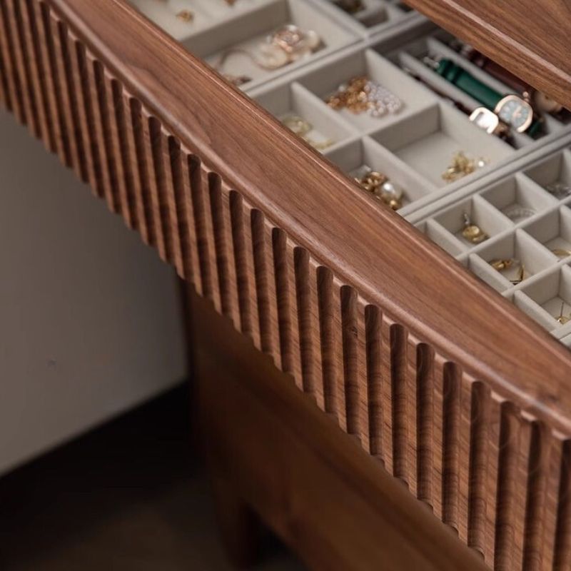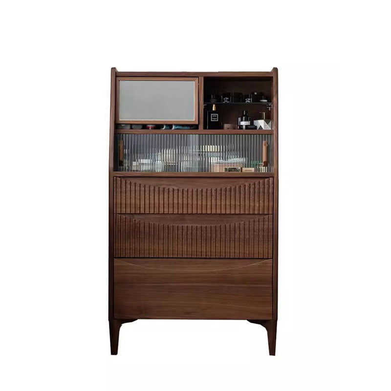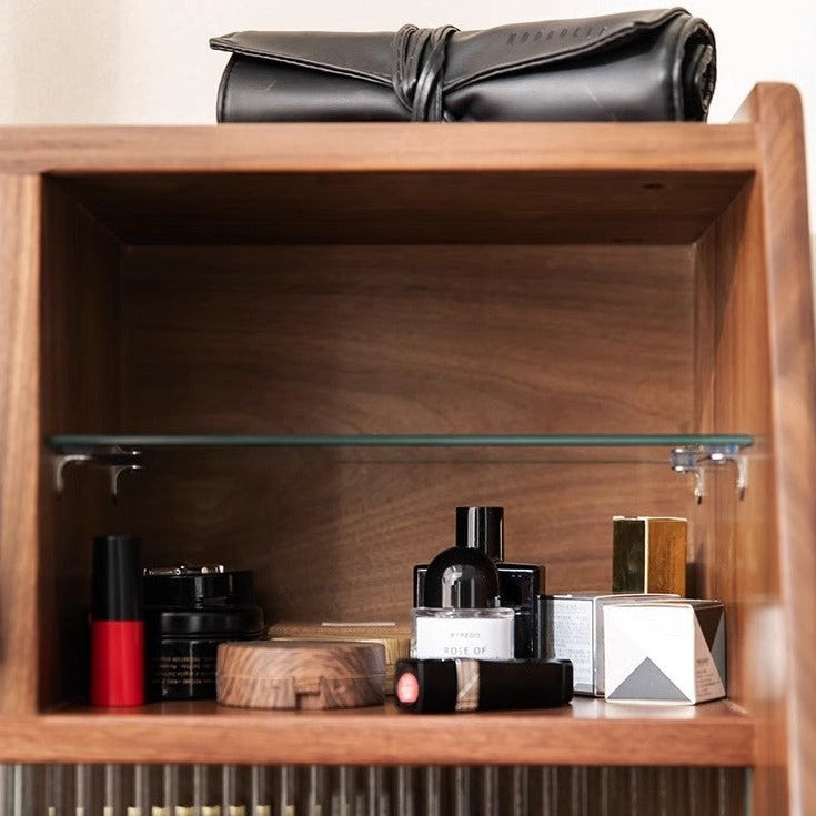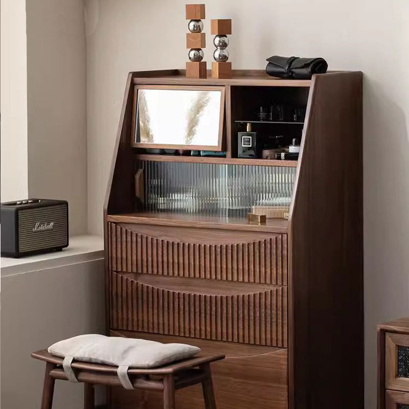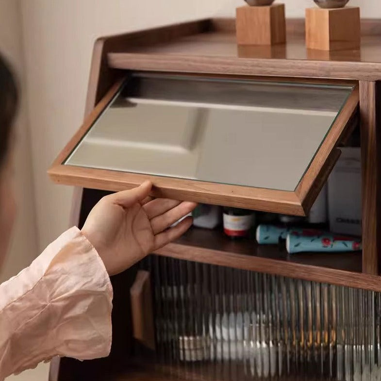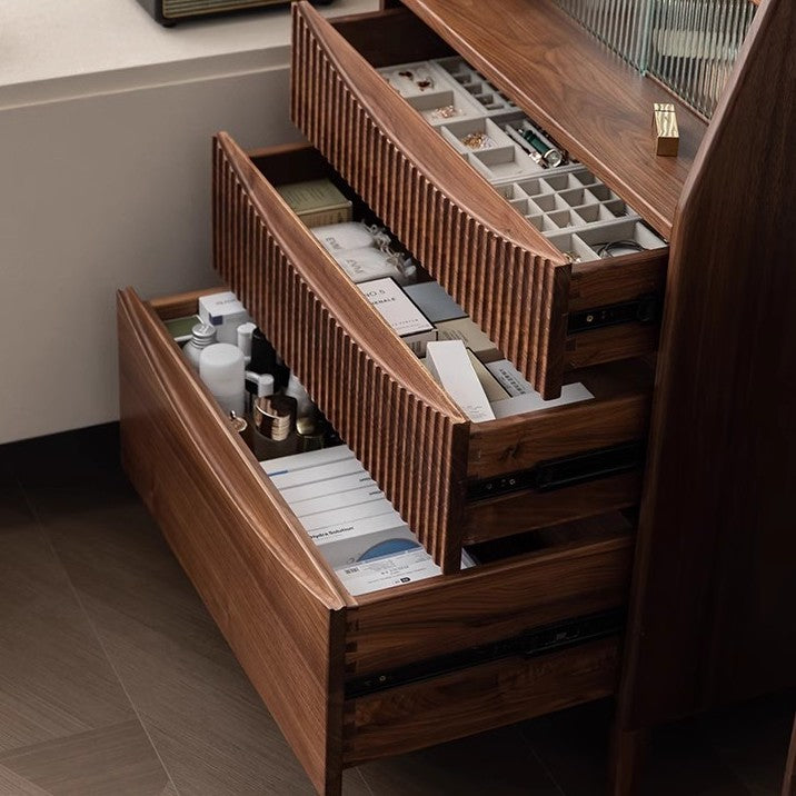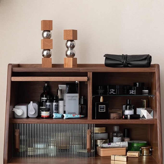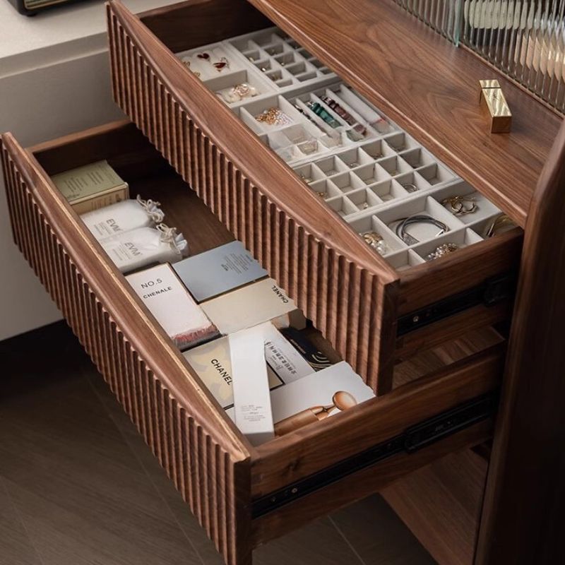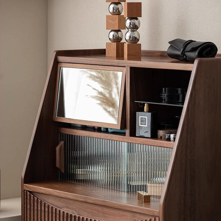 Features: Crafted from imported North American black walnut, this multifunctional storage cabinet combines the practicality of a dressing table with a sophisticated and beautiful design. It not only provides ample storage space for easily organizing daily necessities, but also boasts a top platform perfect for applying makeup or organizing personal items, making it an elegant and indispensable piece of furniture in your home.