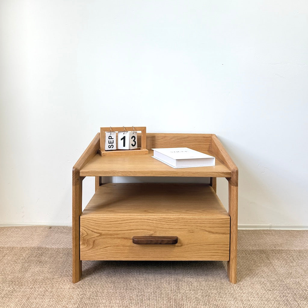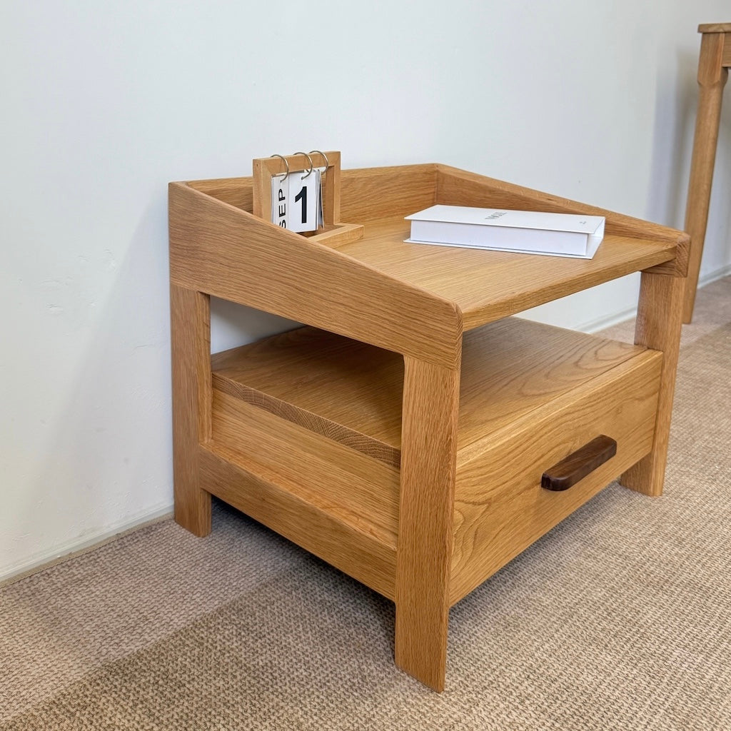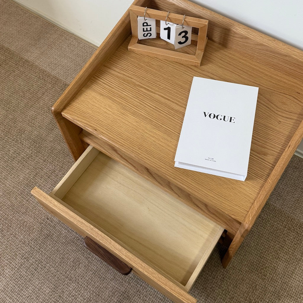 Features: Made of white oak imported from North America. This bedside table features a simple yet elegant design, accented by walnut handles, adding a touch of class. The practical storage space provides convenient storage for everyday items, adding a natural and warm touch to the bedroom.