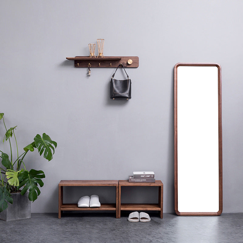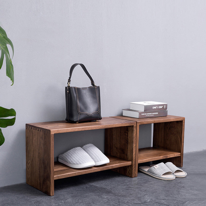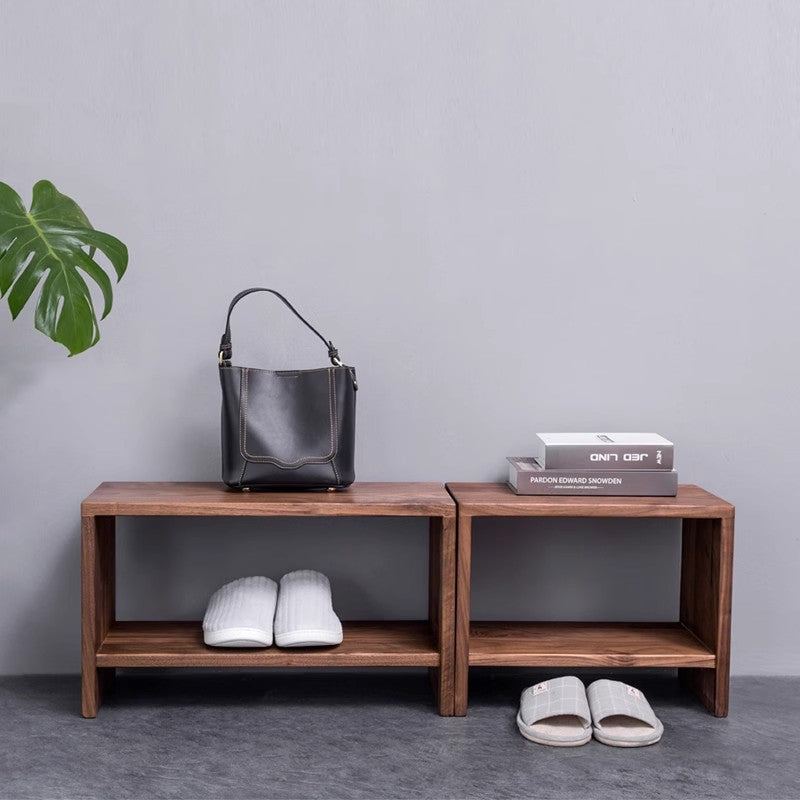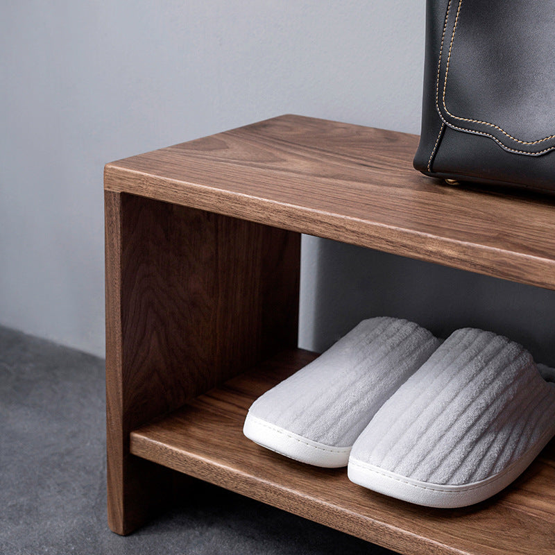 Features: Crafted from imported North American black walnut, this Nordic-style shoe bench is crafted from high-quality solid wood and finished with a wood wax oil finish for a natural look and durability. Its simple design and warm tones blend easily into any interior, providing comfortable seating and convenient shoe storage.