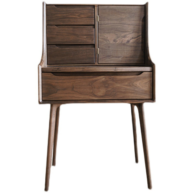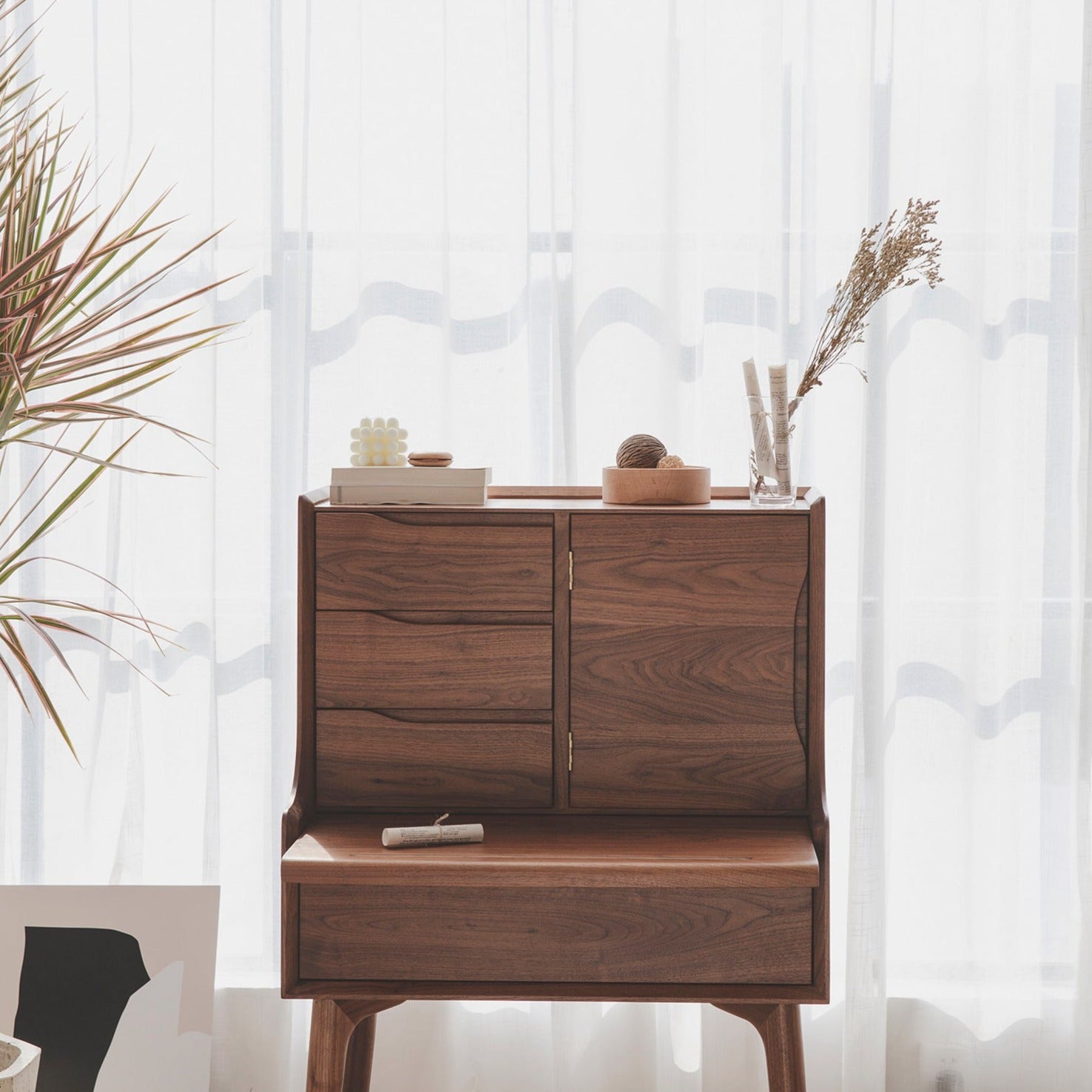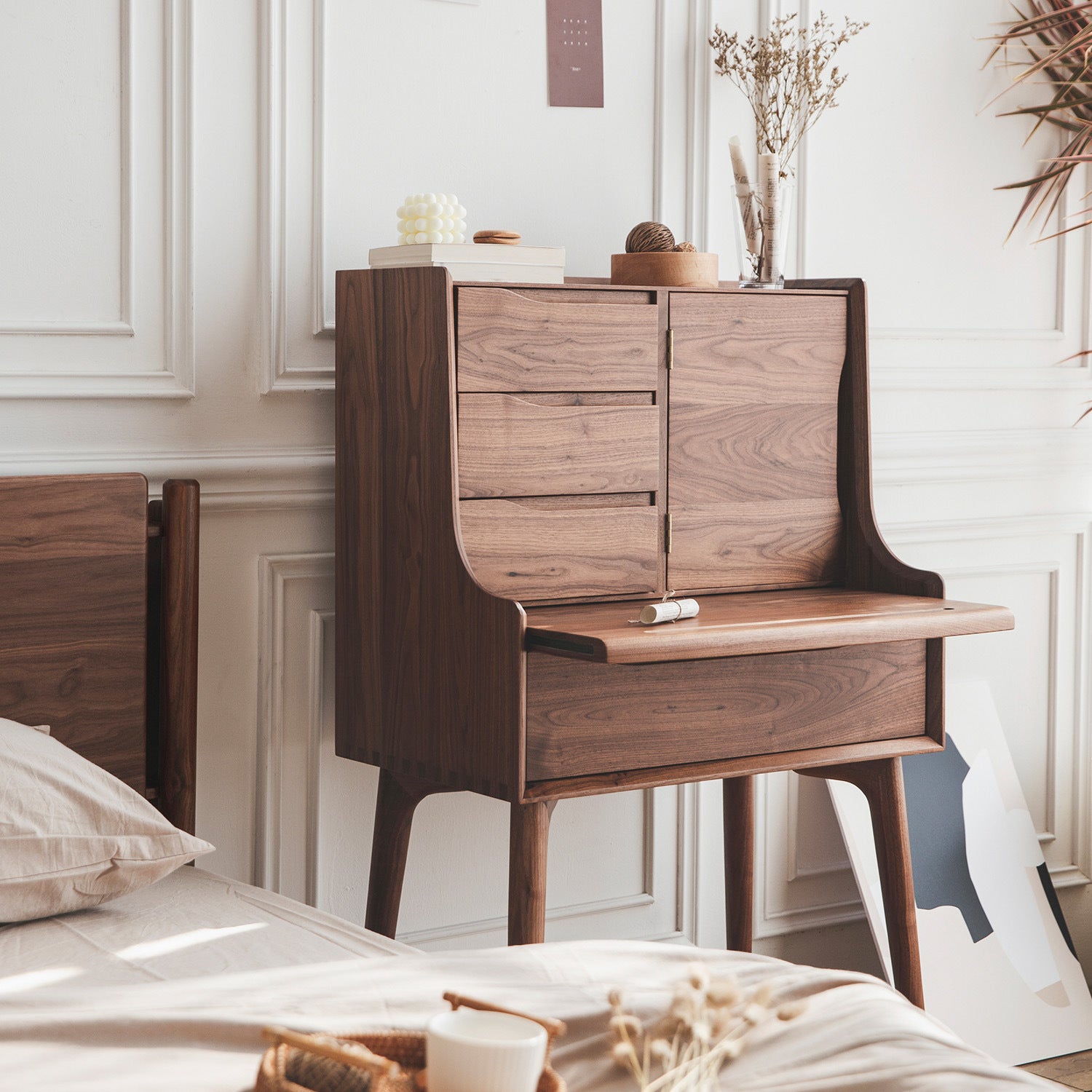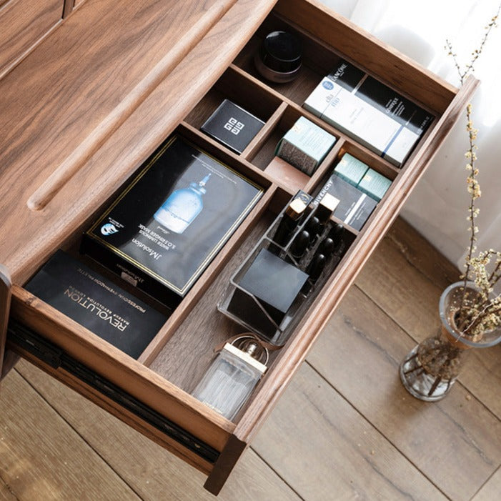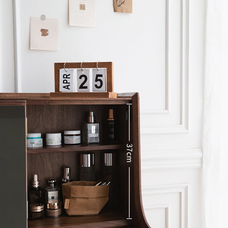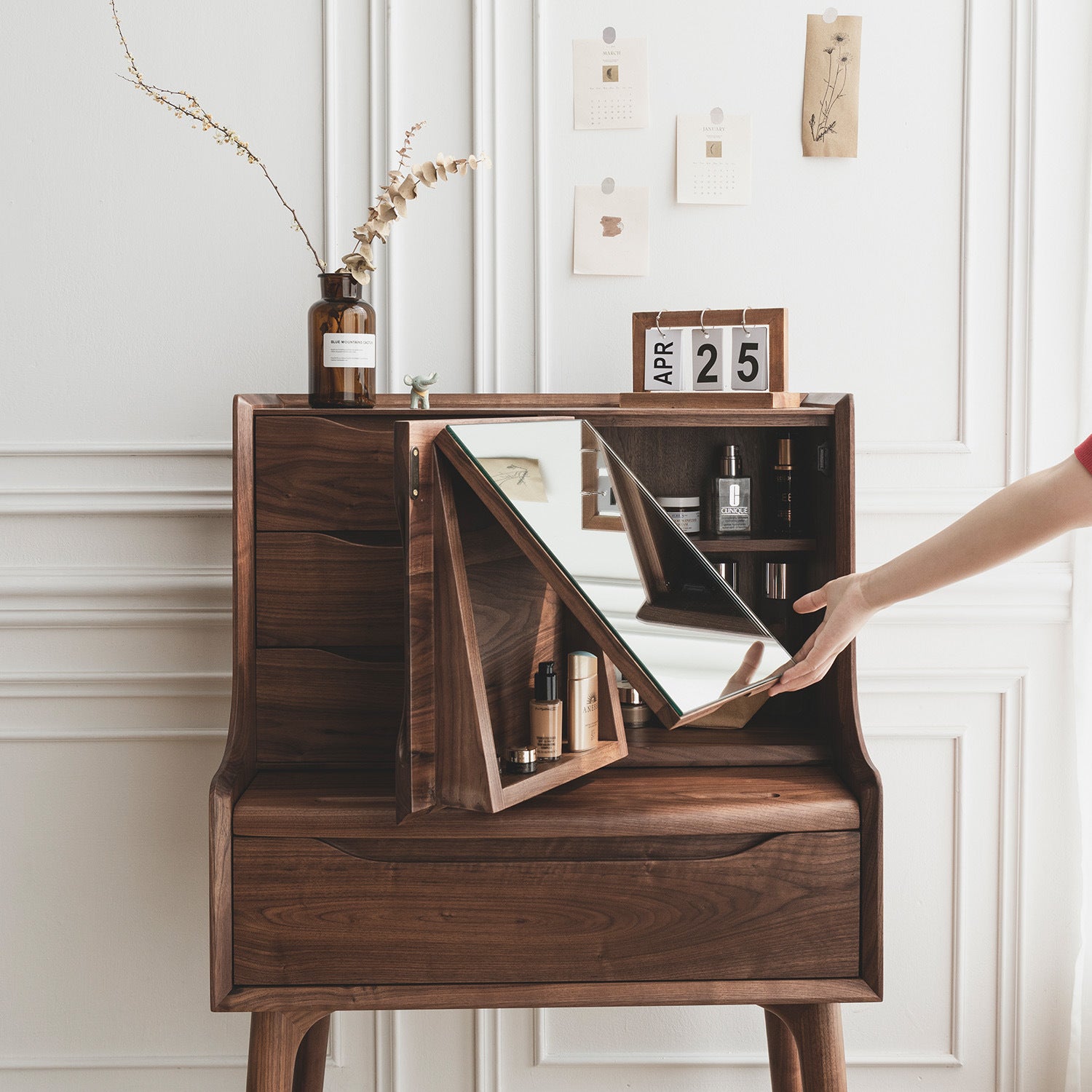 Features: Crafted from imported North American black walnut, this large-capacity black walnut dressing table features a mirror. Its deep wood grain and refined design prevent items from falling, providing ample storage space and creating a stylish and practical dressing nook.