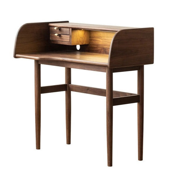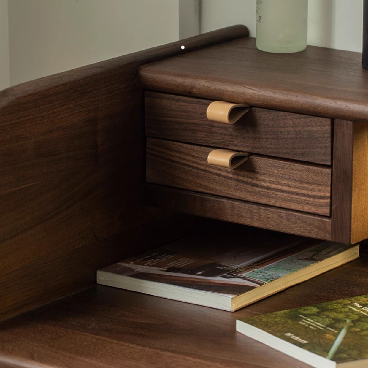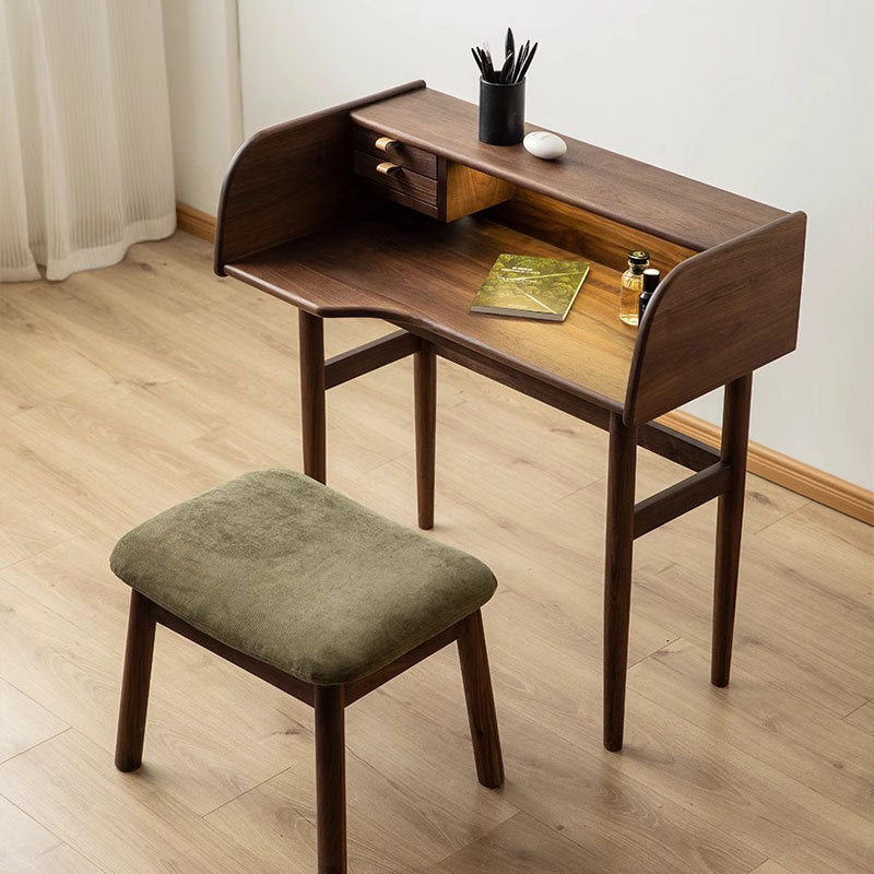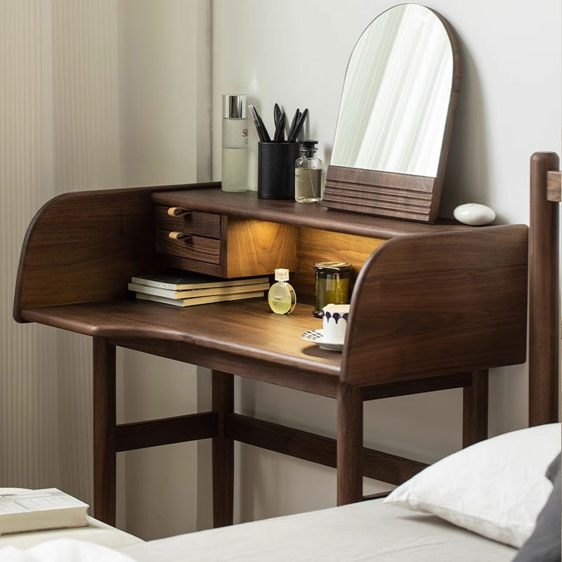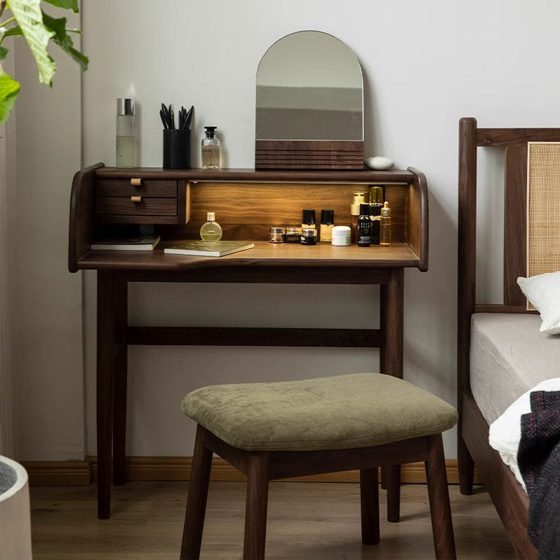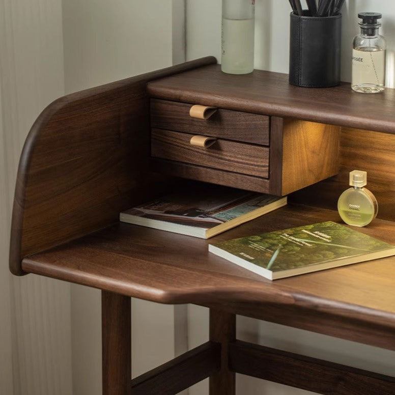 特點:選用北美進口黑胡桃木為材。這款黑胡桃木梳妝台專為小戶型設計。深沉的木紋質感搭配實用的設計,提供充足的收納空間,同時為您打造一個舒適且時尚的梳妝區域。