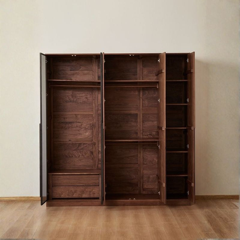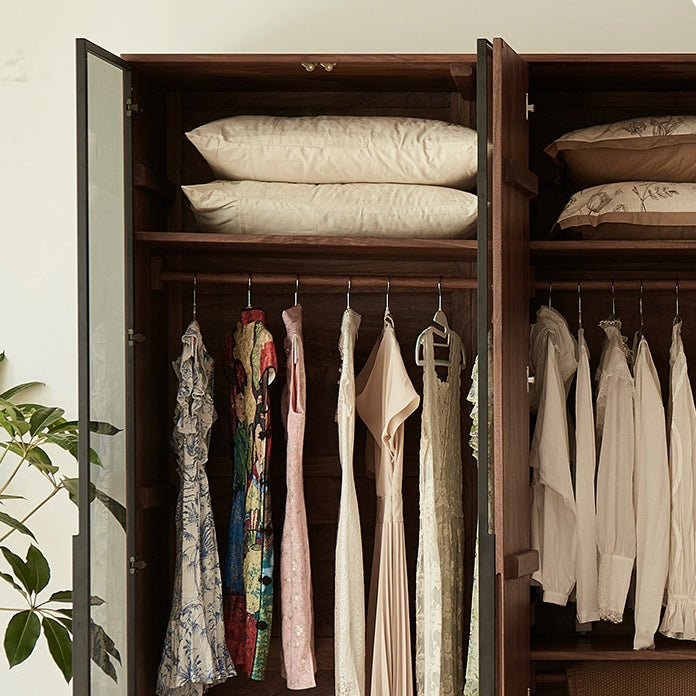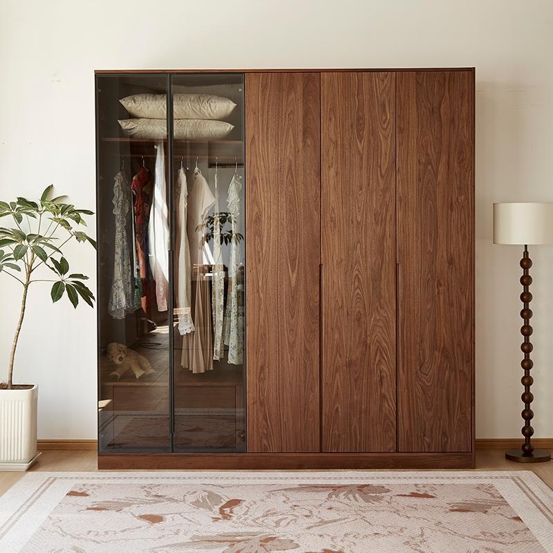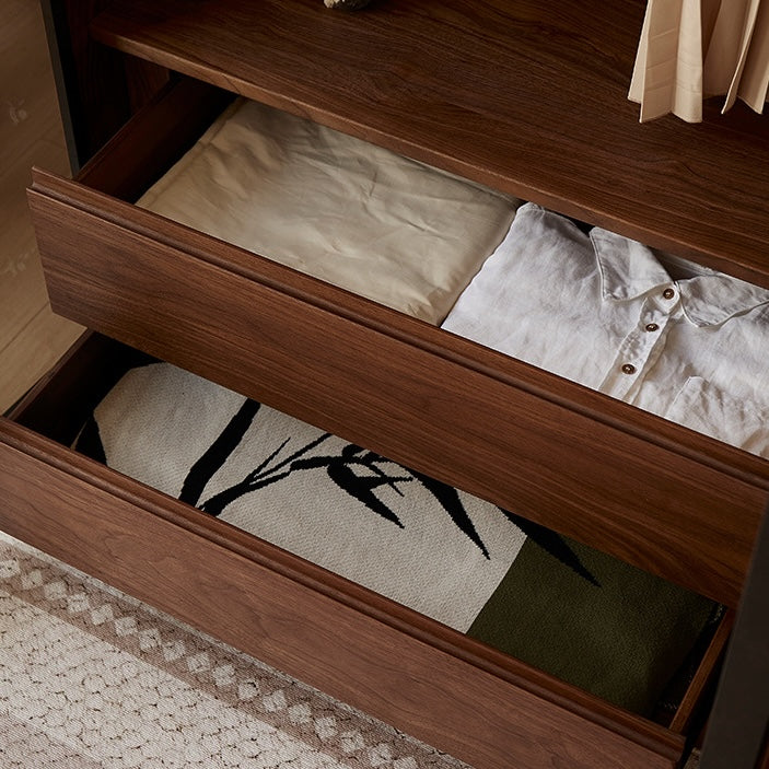 特點:選用北美FAS級進口黑胡桃木為材。採用優質實木打造,結構穩固耐用。衣櫃內部分區清晰,結合掛衣區、層板與抽屜設計,輕鬆收納四季衣物。外觀簡約俐落,線條細緻,兼顧美感與實用性,適合不同家居風格,提升臥室整體質感。
