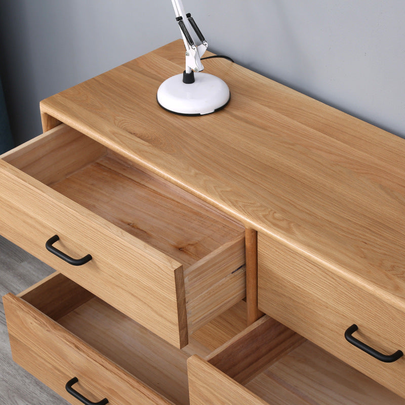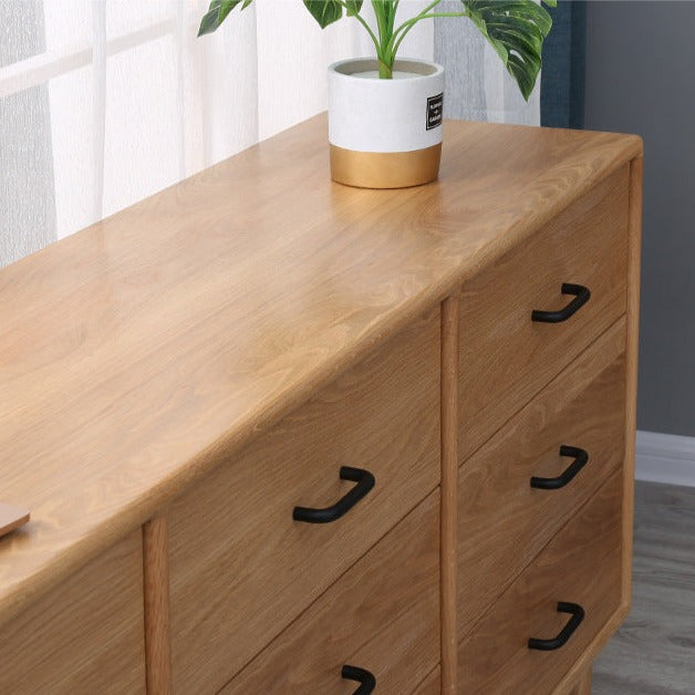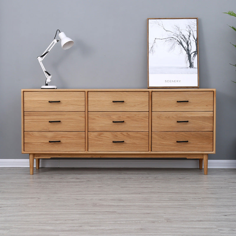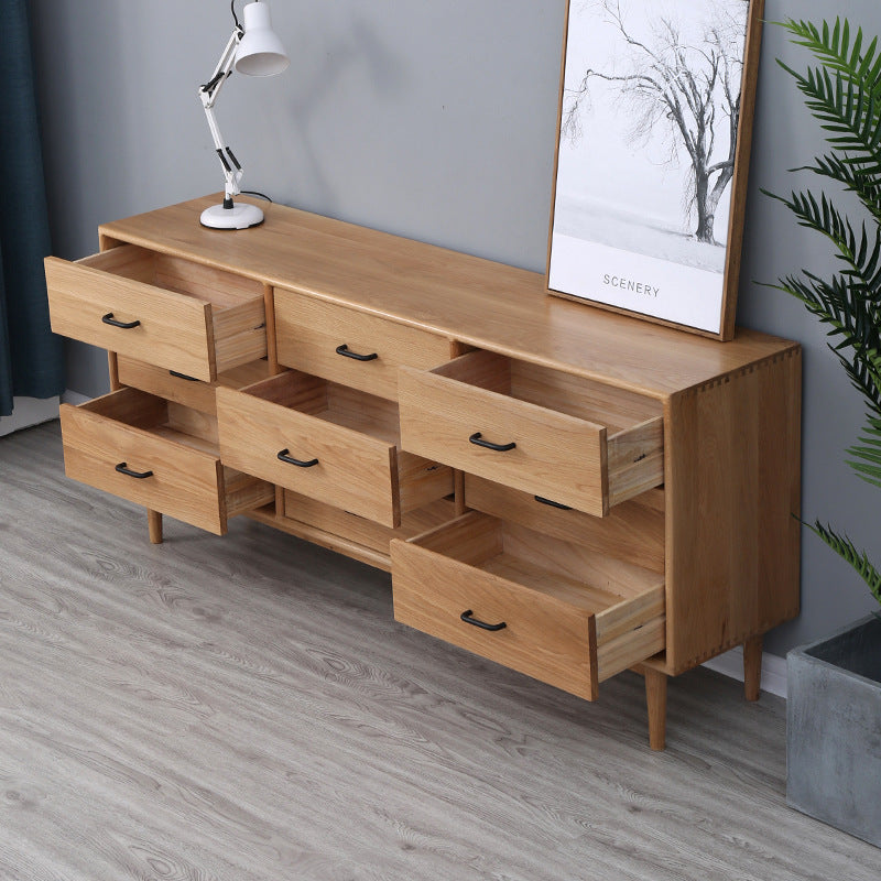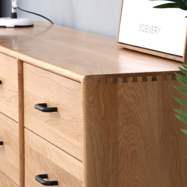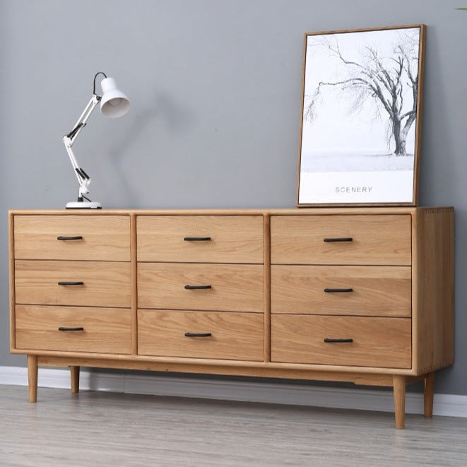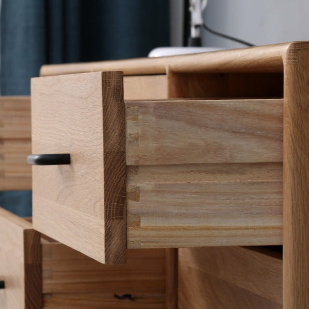 特點:選用北美進口白橡木為材。設有九個抽屜,儲物空間猶如衣櫃一般充足。抽屜採用實木滑軌代,替傳統易生鏽變形的金屬滑軌,大大延長使用壽命。板面採用眼尾榫技術契合,十分穩固耐用。