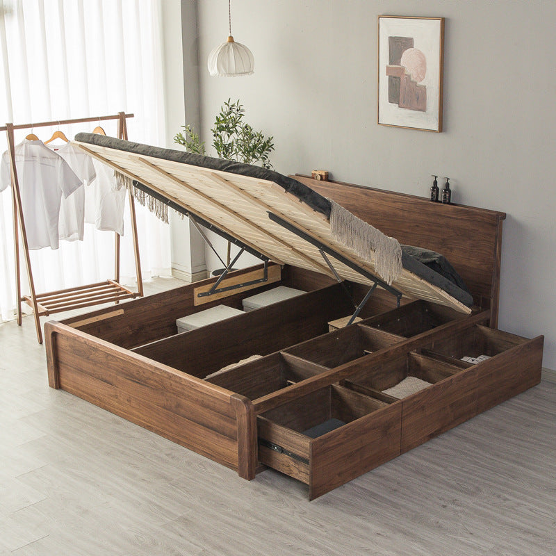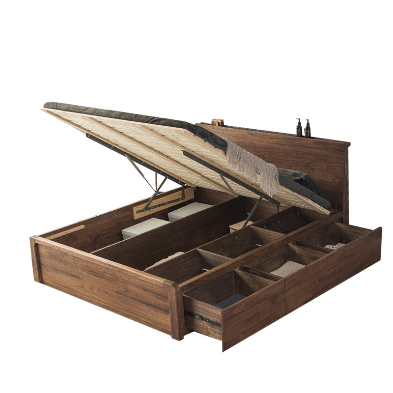 特點:選用北美進口黑胡桃木為材。這款油壓床可提供超大的儲物空間,還具有單側抽屜和床頭置物架,方便整理日常小物件。這款床設計獨特,落地式結構穩固耐用,搭配精密的液壓桿,提供舒適的調整和支撐。