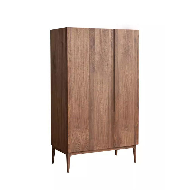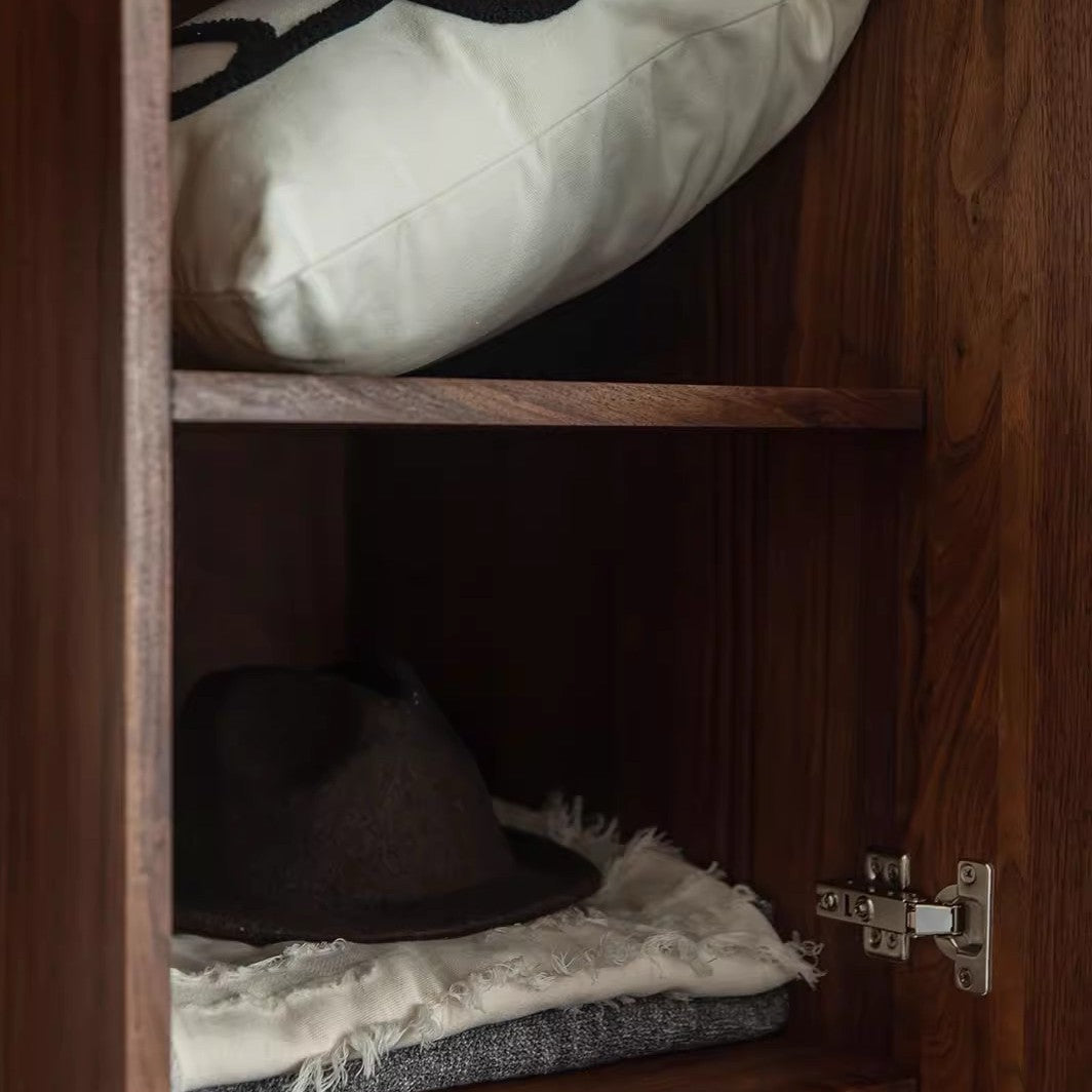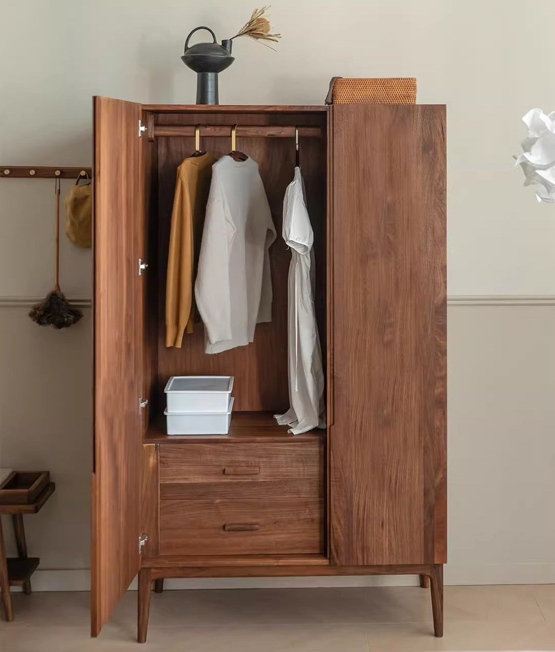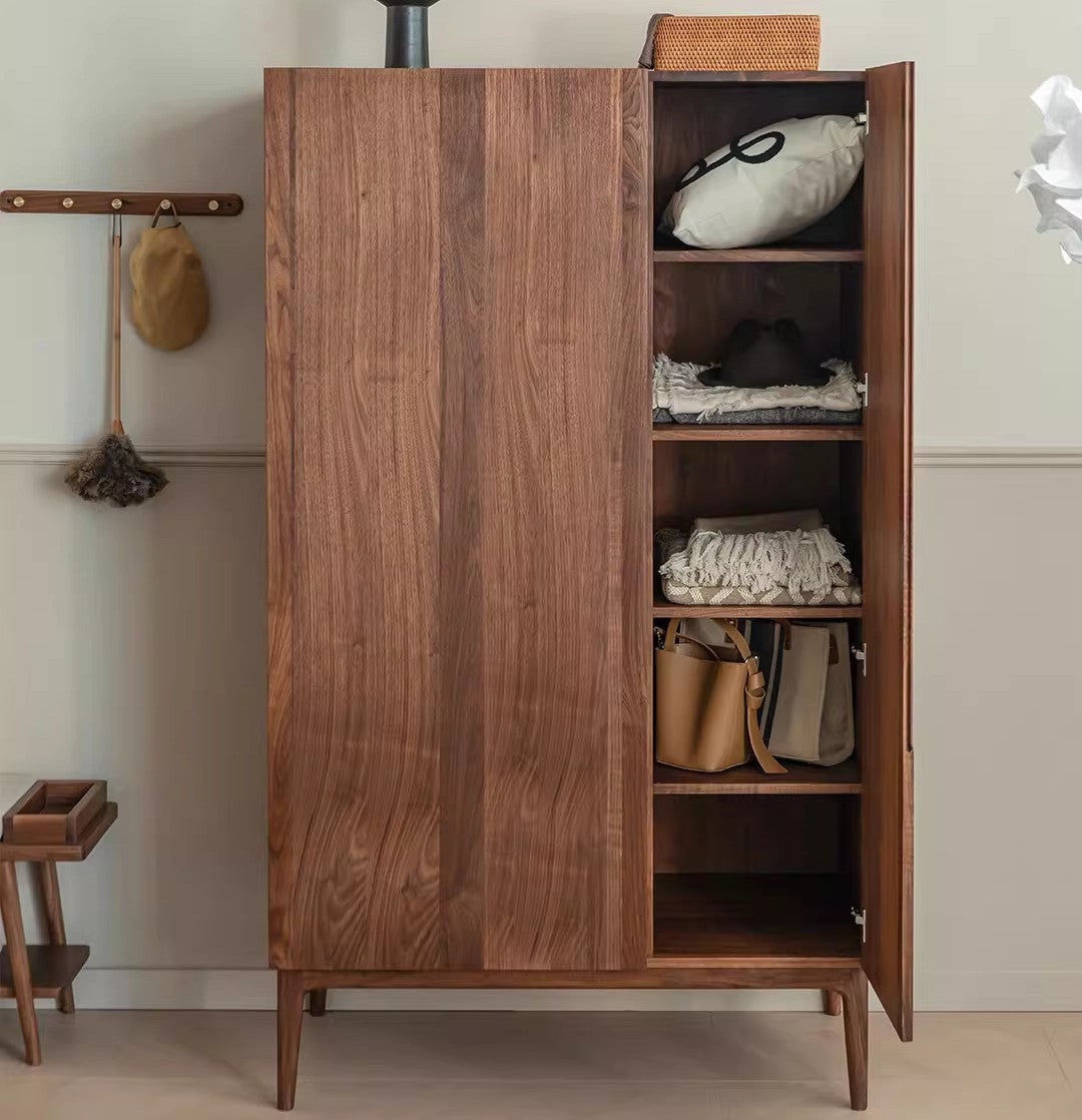 特點:選用北美進口黑胡桃木為材。這款黑胡桃木衣櫃以其典雅的設計和優質的材料著稱。精心打造的木質結構提供了可靠的支撐和耐用性。櫃內設有多層收納空間,能有效整理衣物和物品。其深沉的色調和精緻的紋理為空間增添了奢華感和品味。
