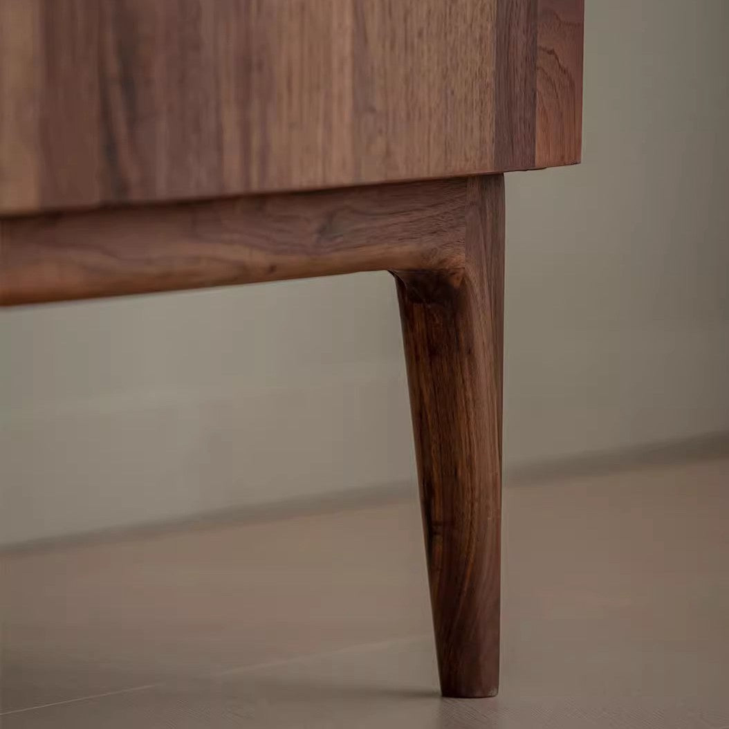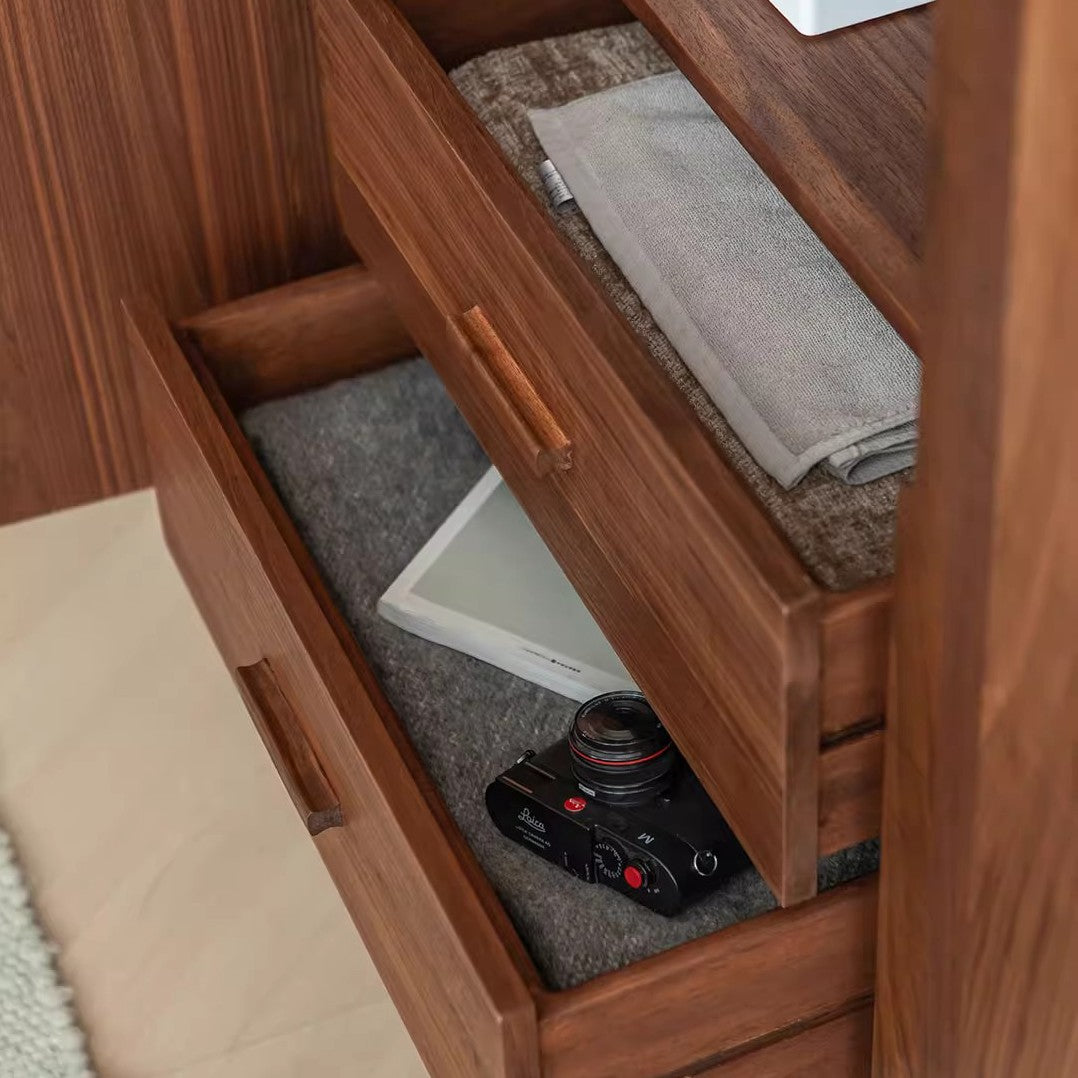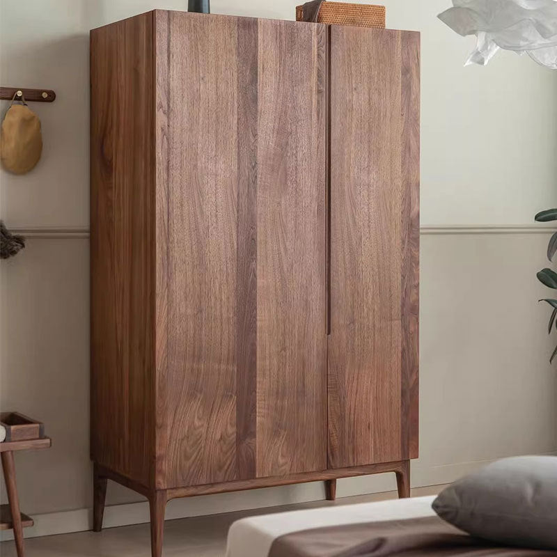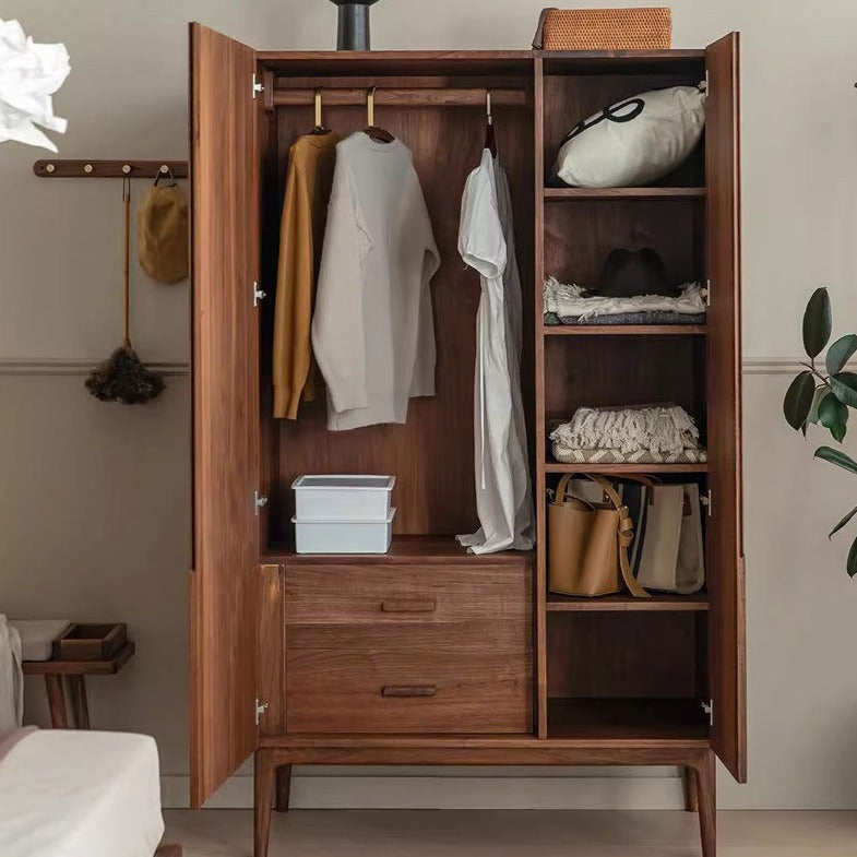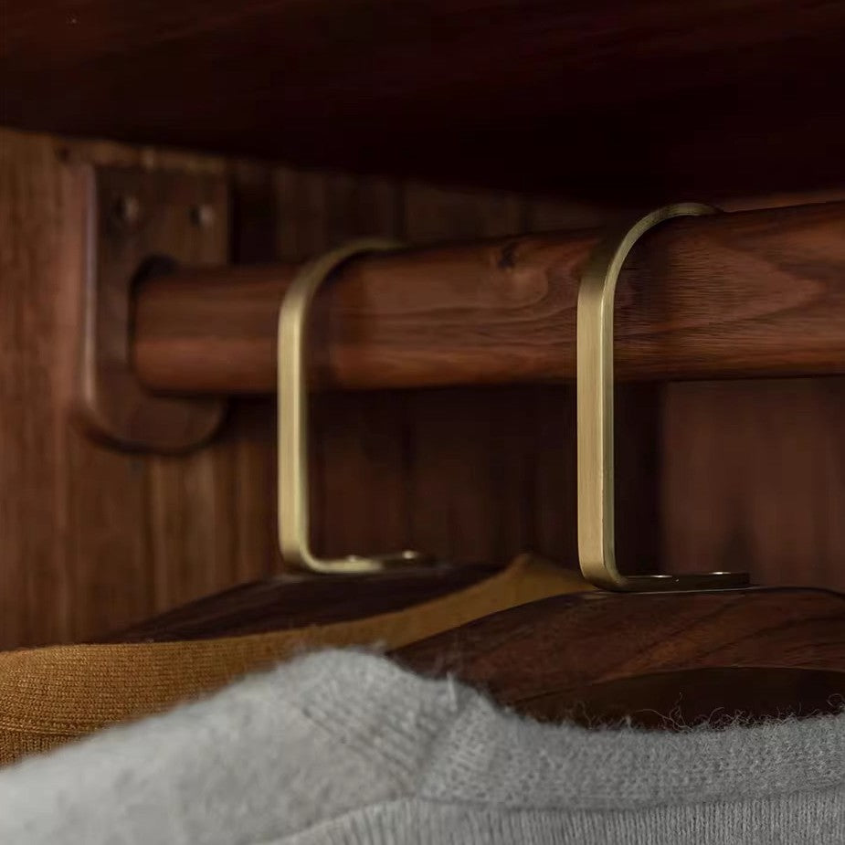 特點:選用北美進口黑胡桃木為材。這款黑胡桃木衣櫃以其典雅的設計和優質的材料著稱。精心打造的木質結構提供了可靠的支撐和耐用性。櫃內設有多層收納空間,能有效整理衣物和物品。其深沉的色調和精緻的紋理為空間增添了奢華感和品味。