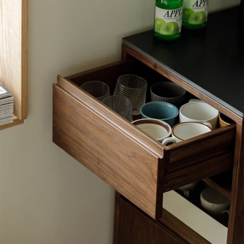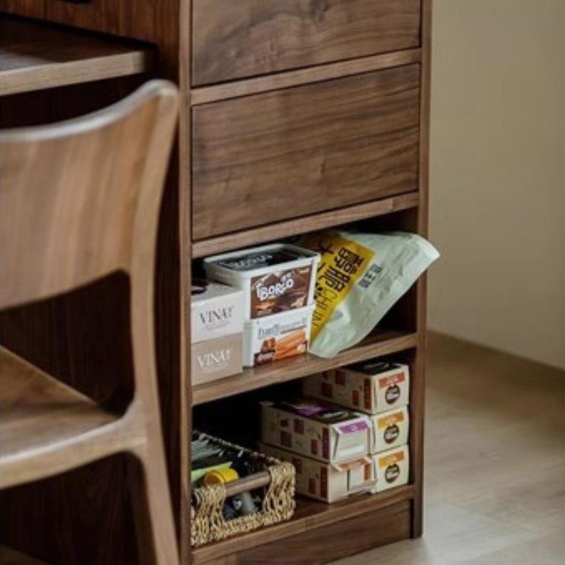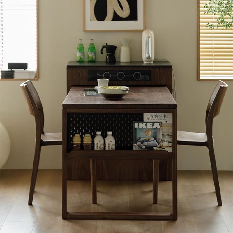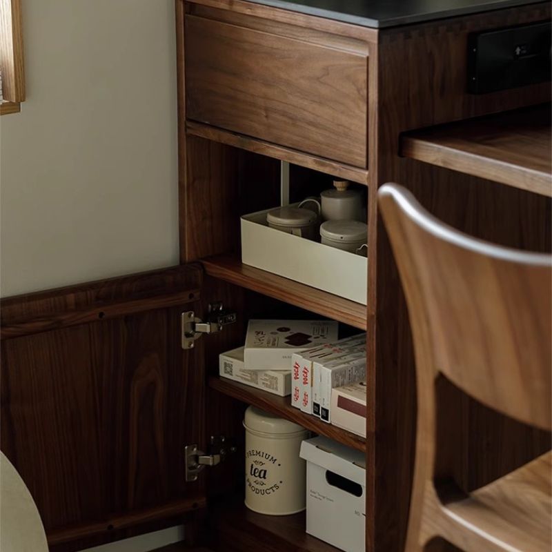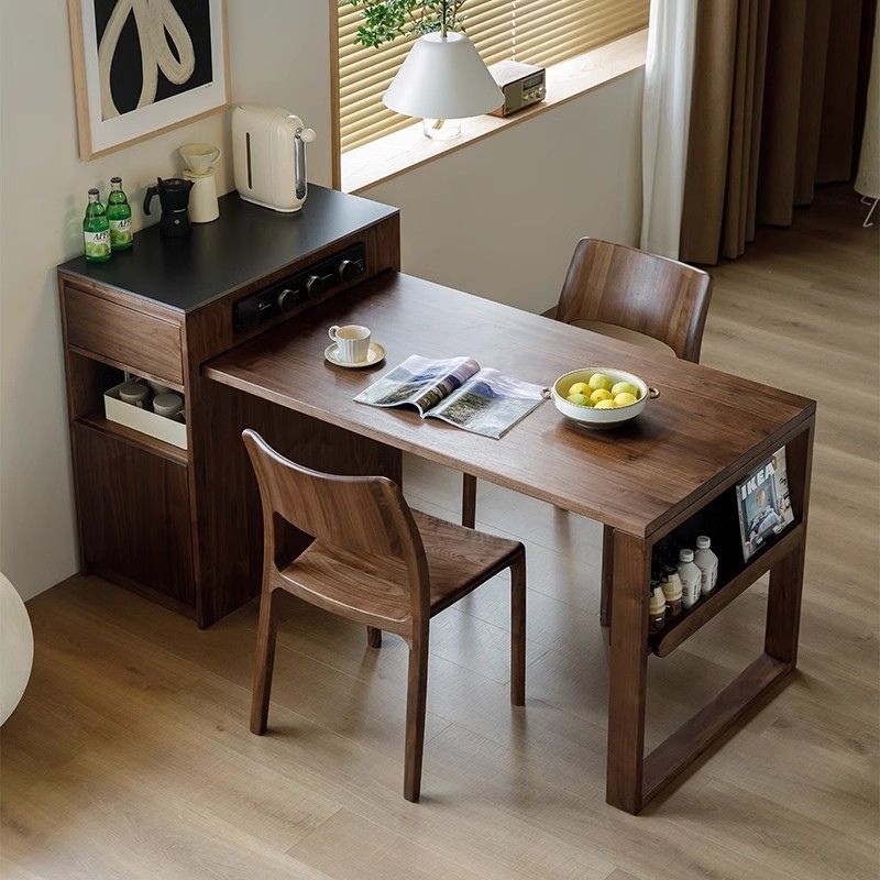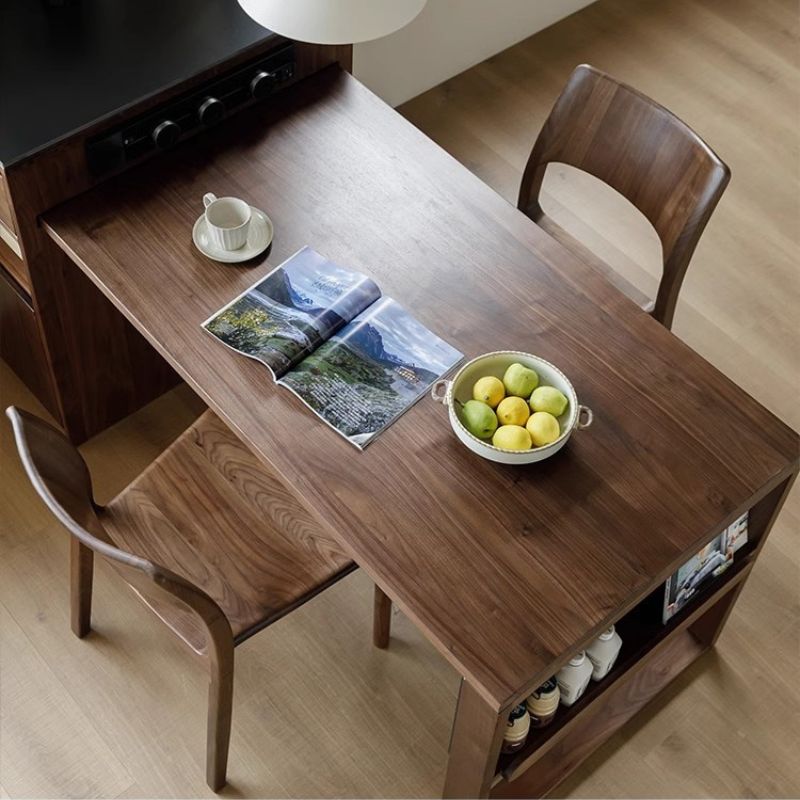 特點:選用北美進口黑胡桃木為材。這款伸縮餐枱連櫃設計簡約時尚,集餐枱與收納功能於一身。櫃面選用高級岩板材質,耐熱耐刮,易於清潔。餐枱可伸縮,適應不同人數需求,讓空間運用更靈活。櫃體提供豐富收納空間,是小家庭和現代都市生活的理想選擇。