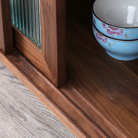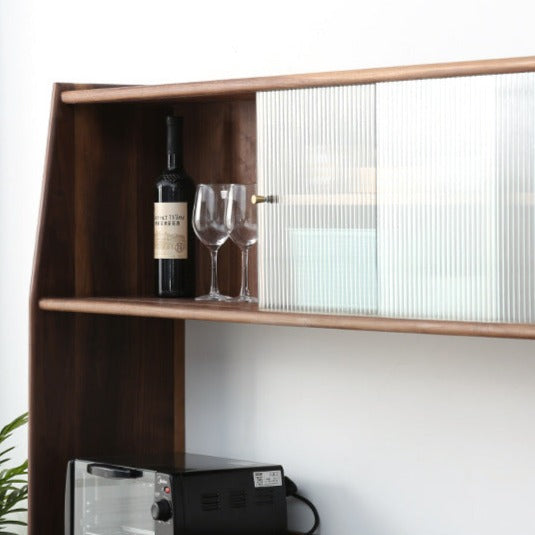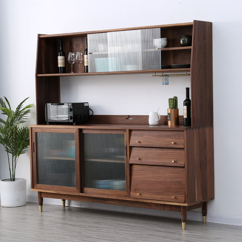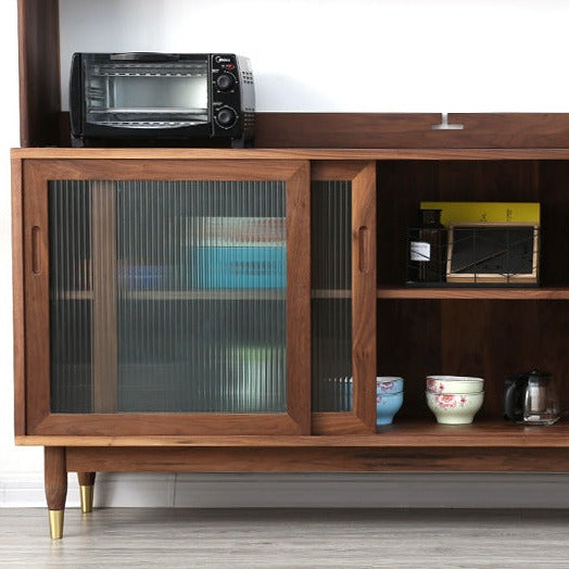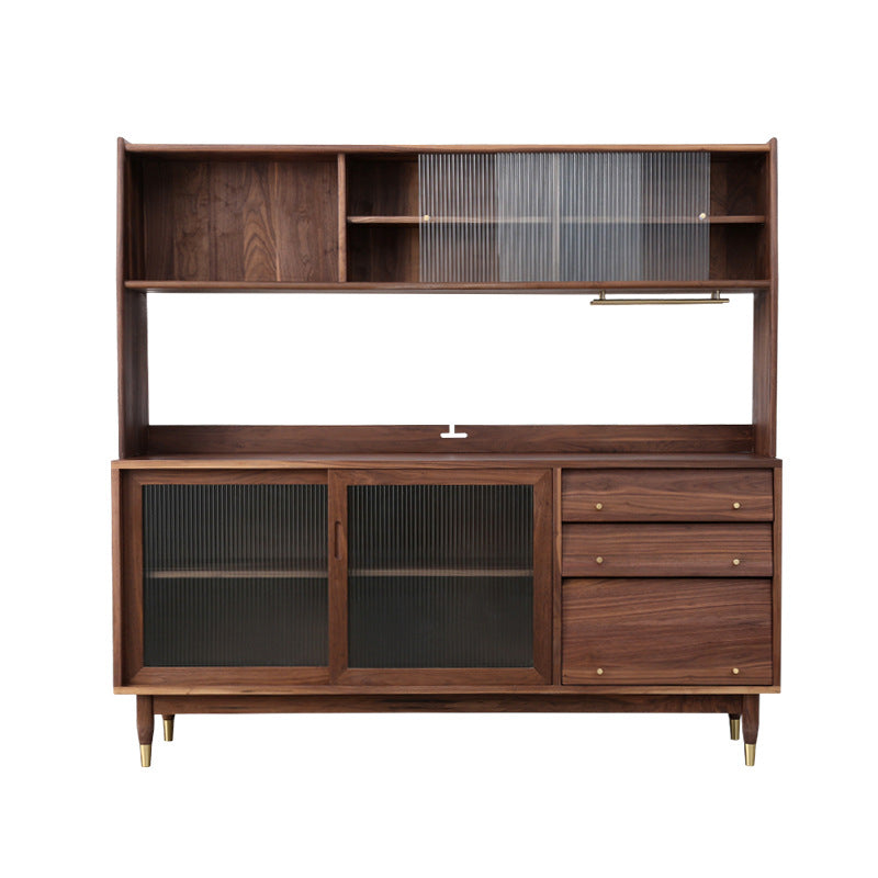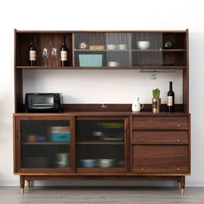 特点:选用北美FAS级进口黑胡桃木为材。这款黑胡桃木餐边柜的设计相当实用且具风格。上柜被分为三格,左边一格为开放式储物格,方便存放您需要经常拿取的物品。右边两格是玻璃橱窗,可用于展示精美的餐具或装饰品。上柜下沿设有两根黄铜挂杆,可以搭配S型挂钩,方便挂挂锅具或厨房小工具。而宽大的台面提供了足够的空间,适合摆放大部分厨房小家电,增加了厨房的实用性。这款餐边柜既美观又实用,为您的厨房带来了功能性和风格。