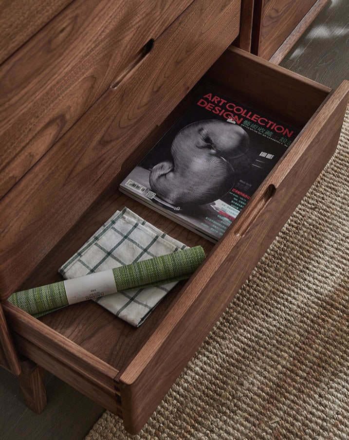 特点:选用北美FAS级进口黑胡桃木为材。边角位采用防撞设计,防止家庭成员意外撞伤。抽屉采用实木导轨,加厚实木内板。表面涂木蜡油,展示实木家俬的天然属性。