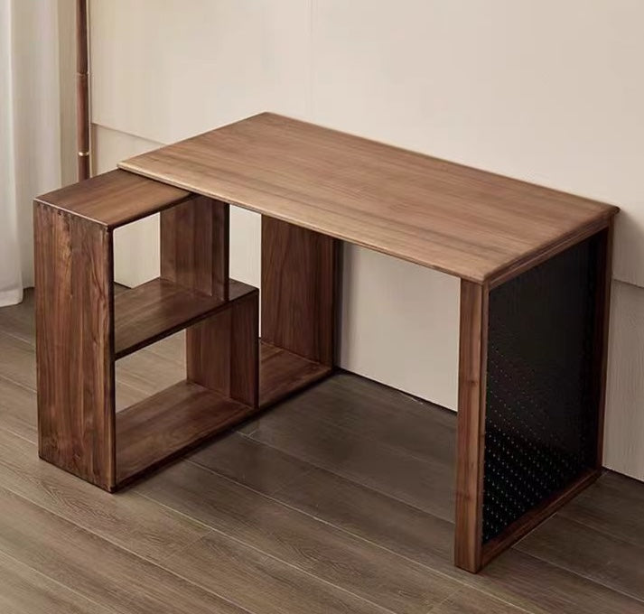 特點:選用北美進口黑胡桃木為材。這款檯連櫃設計簡約實用,融合寬敞桌面與多功能收納空間,適合工作或學習。堅固材質搭配流暢線條,展現現代風格。檯面平整耐用,櫃體設有多層格局,方便收納文件與日常用品,讓空間更整潔有序,是家居與辦公的理想之選。