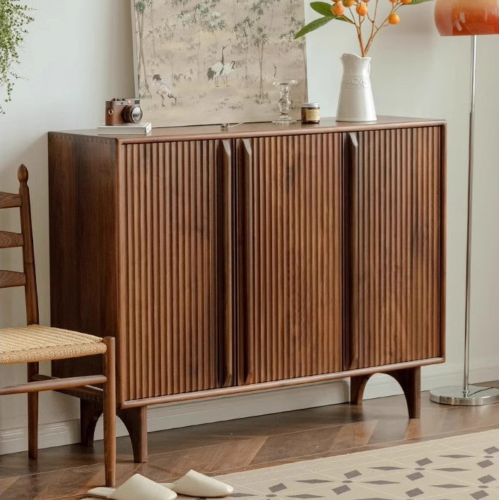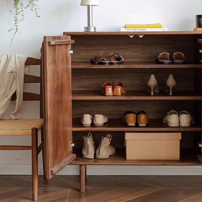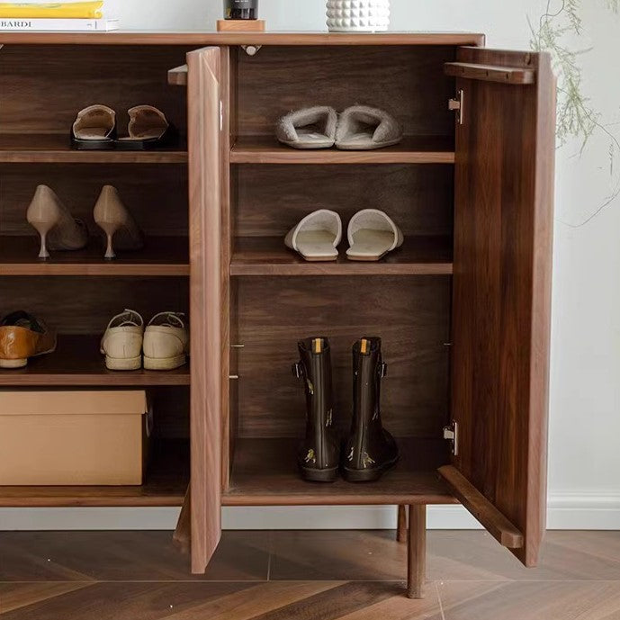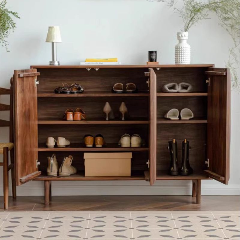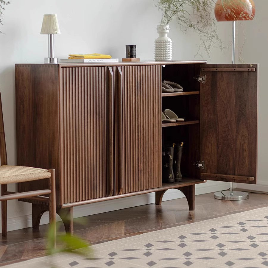 特点:选用北美FAS级进口黑胡桃木为材。这款鞋柜设计具有独特的竖纹门面,为您的家增添一抹现代感。其内部配备了多层隔板,可根据需要自由调节高度,方便存放各种尺寸的鞋子。不仅外观时尚,更具备高度实用性,是家居收纳的理想选择。