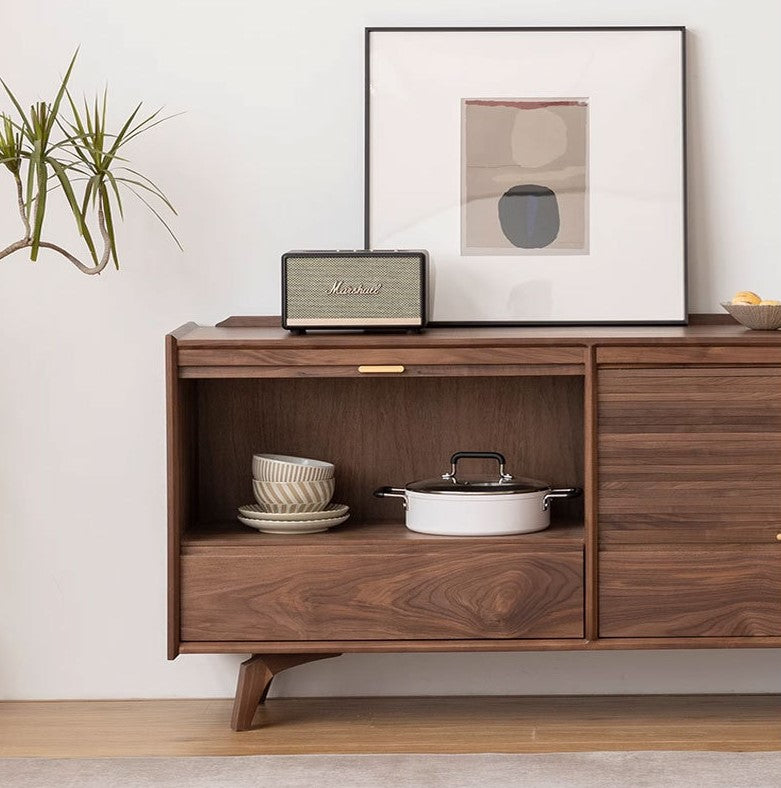 特点:选用北美FAS级进口黑胡桃木为材。这款品味生活的餐边柜拥有独特柜脚设计,不仅稳固耐用,更展现时尚感。独特的揭门设计巧妙省去开启空间,让您轻松取物同时充分节省空间。简约设计中不失实用性,完美融合风格与实用性。