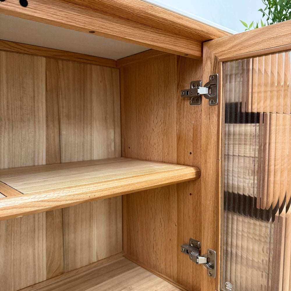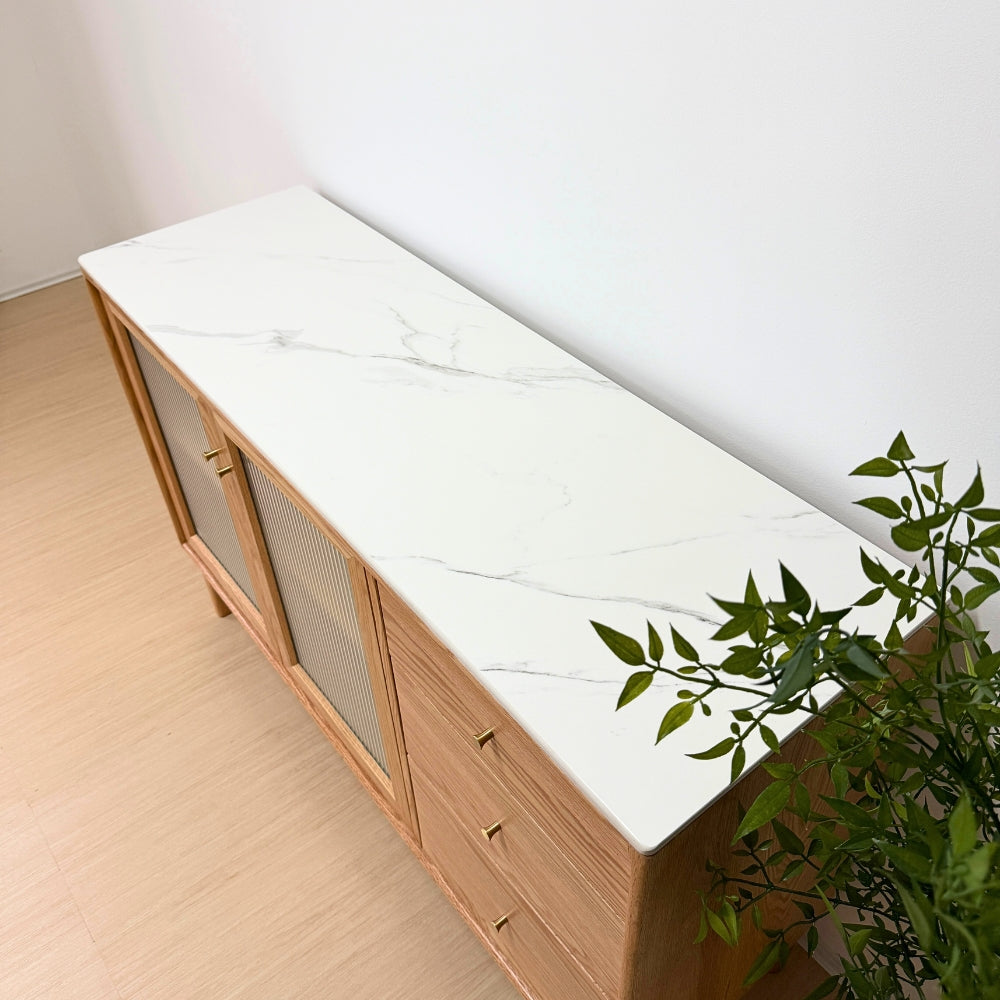 特点:选用北美FAS级进口红橡木为材。这款岩板餐边柜结合现代设计与实用功能。内部设有可调隔板,方便存放不同高度的物品,让空间利用更灵活。外部配有透明玻璃柜门,能清楚展示内部摆设,方便取用。适合各种家居风格,提升用餐区域的品味与实用性。
