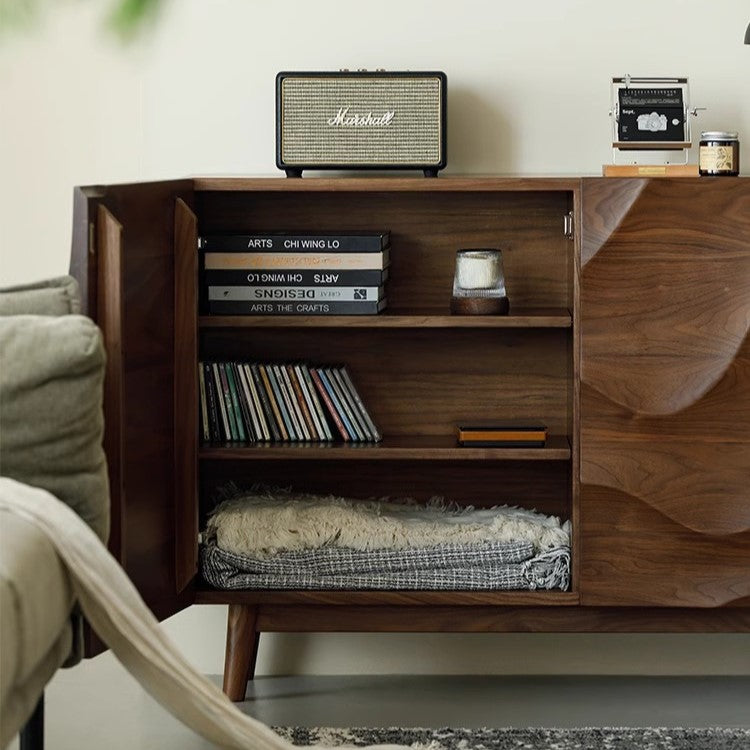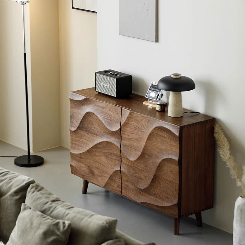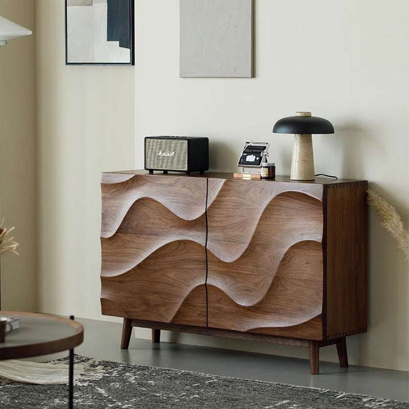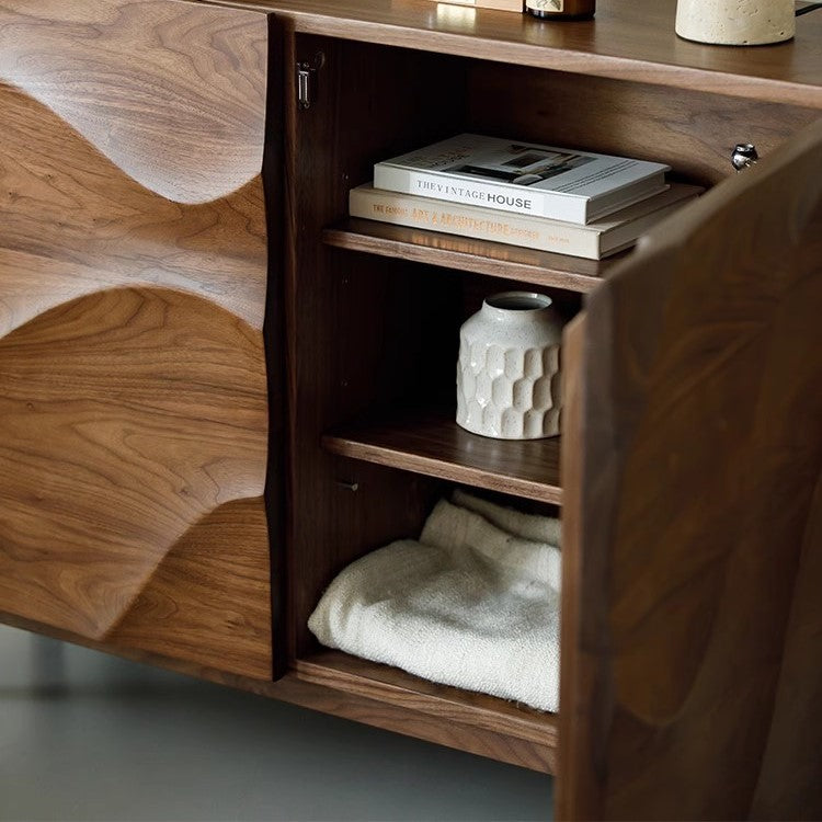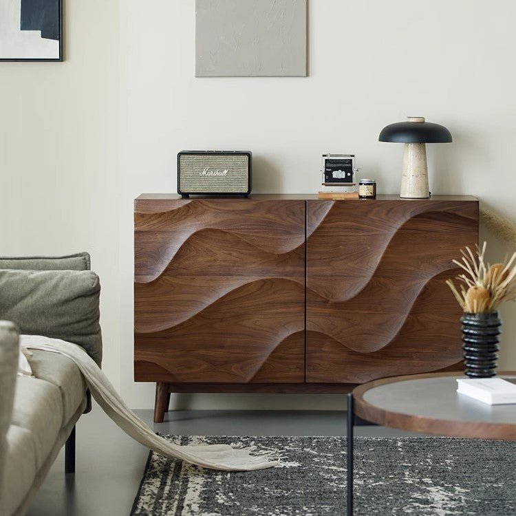 特点:选用北美FAS级进口黑胡桃木为材。这款时尚收纳柜以独特波纹设计为特色,不仅为空间注入艺术氛围,更拥有多层隔板,巧妙分隔收纳空间,让您轻松整理日常用品、餐具、餐盘,实现优雅有序的居家生活。精致工艺与实用性兼具,是您家居空间的理想之选。