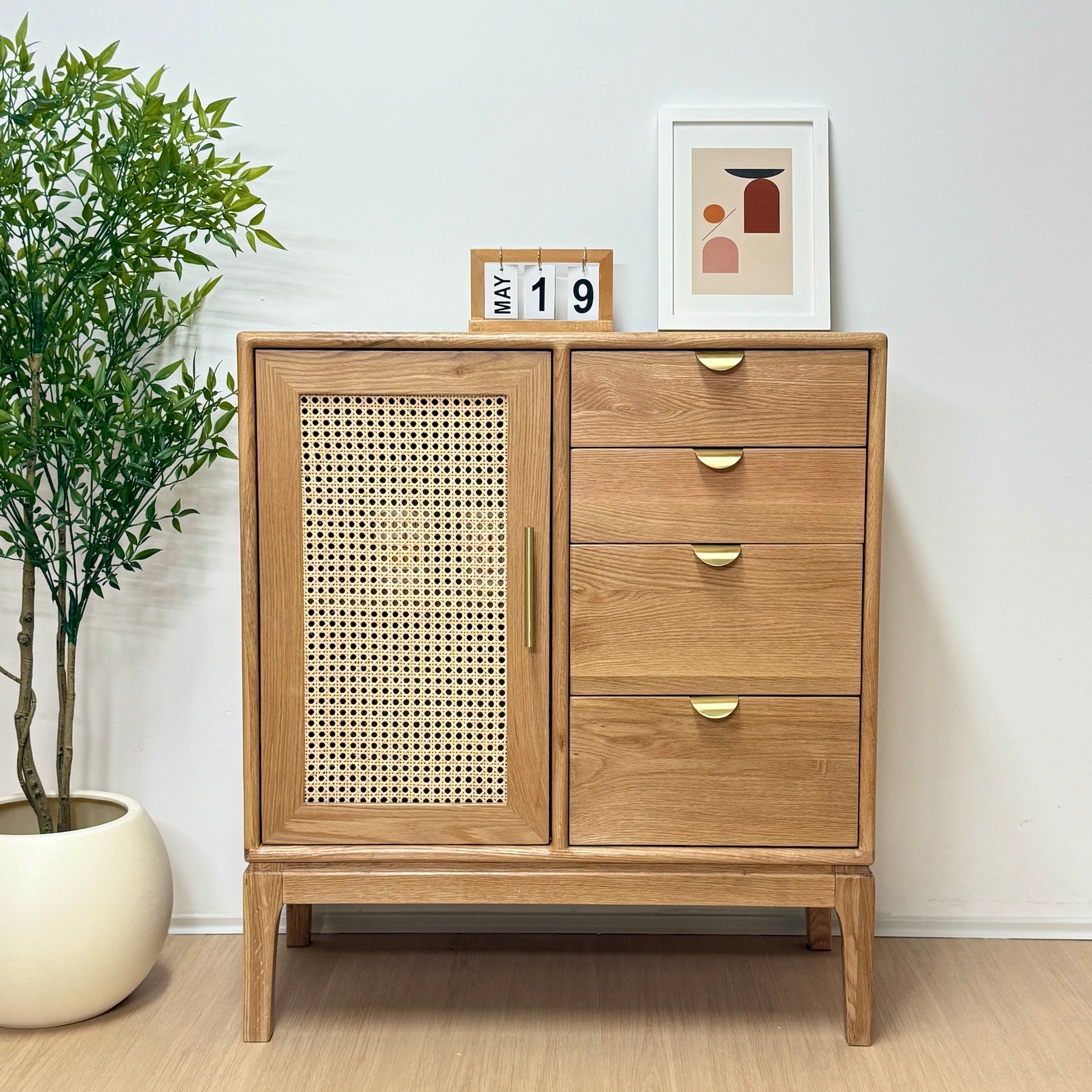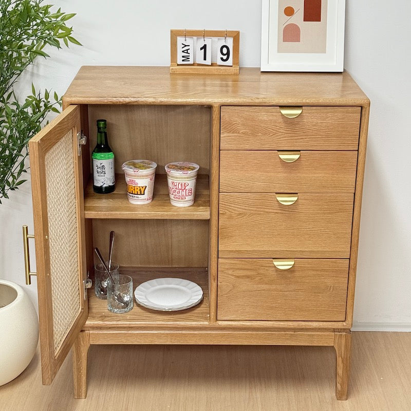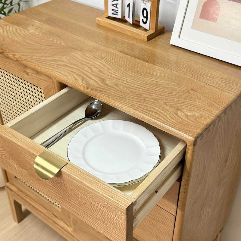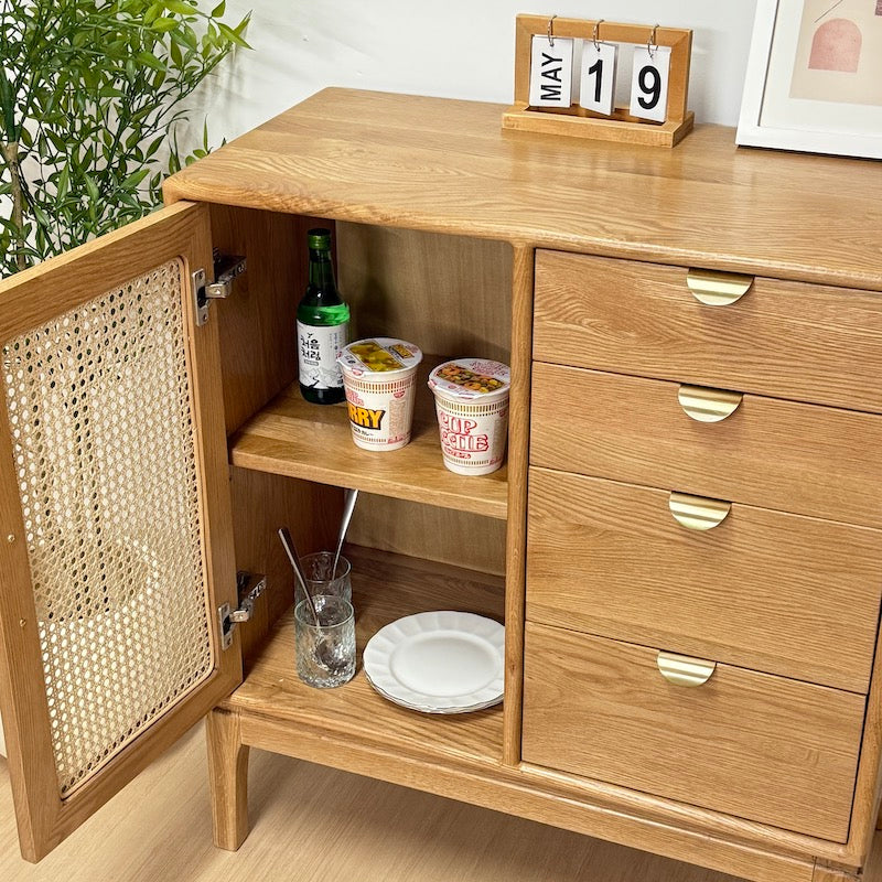 特点:选用北美FAS级进口白橡木为材。这款藤织餐边柜以精致藤编工艺打造,融合现代与自然风格,既实用又具美感。多层收纳设计,提供充足储物空间,适合放置餐具、酒类及各类日常用品。耐用的材质与自然的质感,为您家里增添一抹清新自然的氛围。