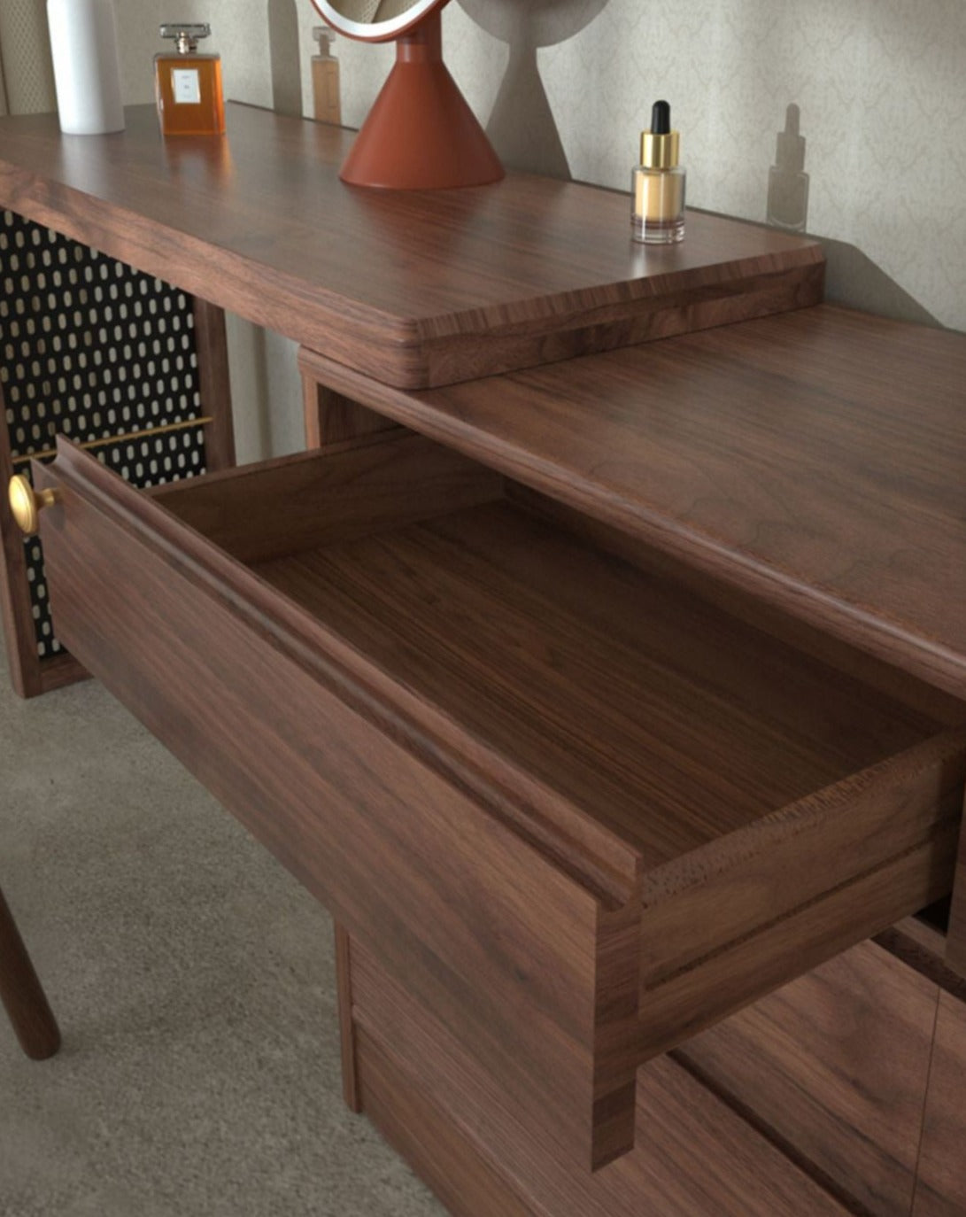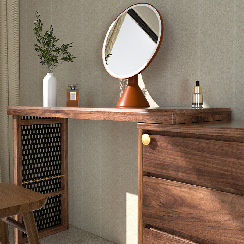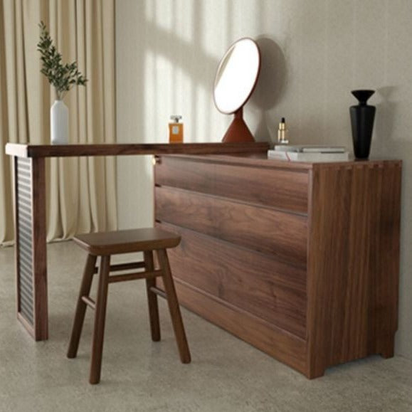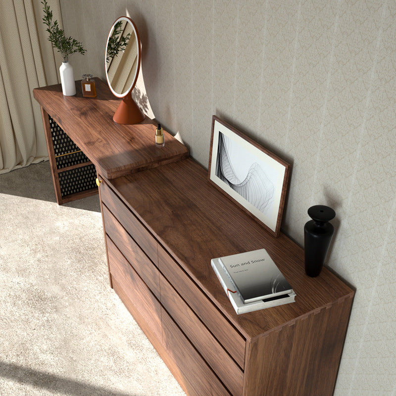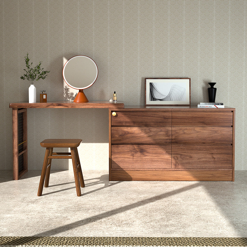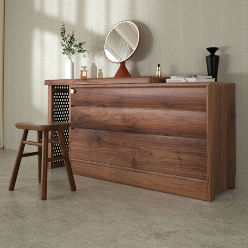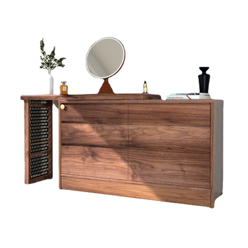 特点:选用北美FAS级进口黑胡桃木为材。六斗柜和梳妆台的完美融合,超大收纳空间,亦满足你日常化妆需求。可伸缩亦可以旋转90度。 40cm深的尺寸适合小户型,与床尾预留40cm距离左右,够一个人行过!最左边的洞板也可摆放书籍。设计已经帮你预了脚线位置,防止无法靠墙。