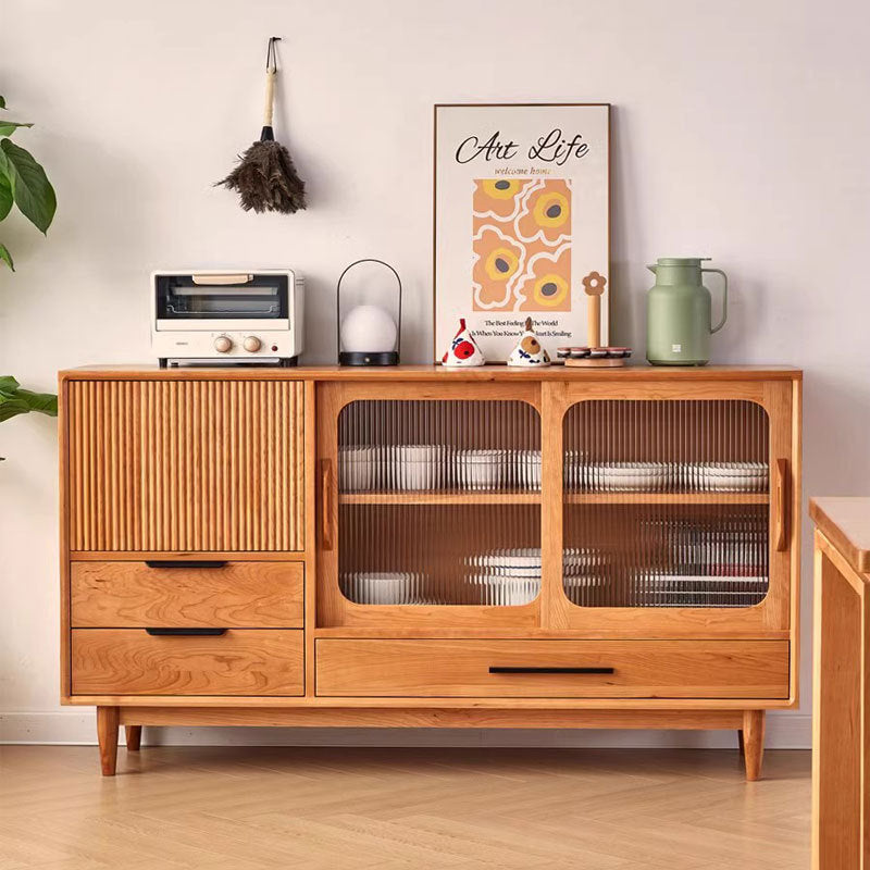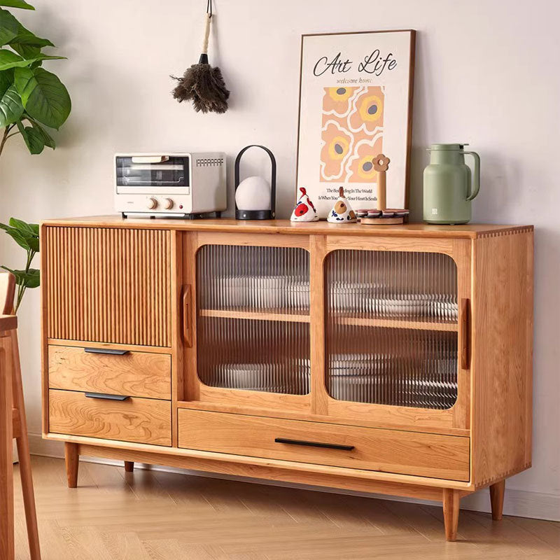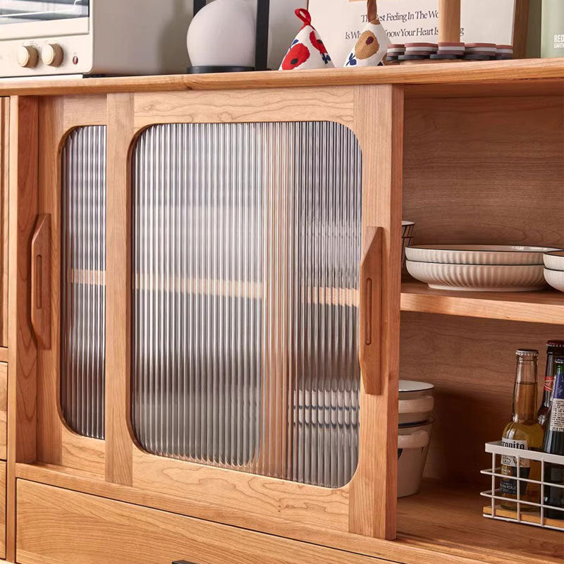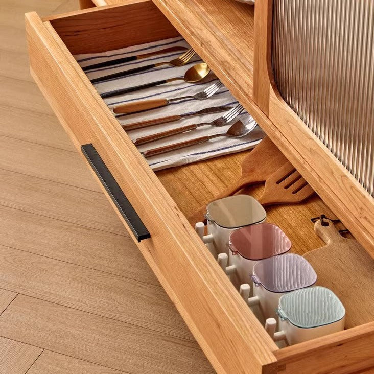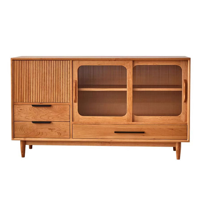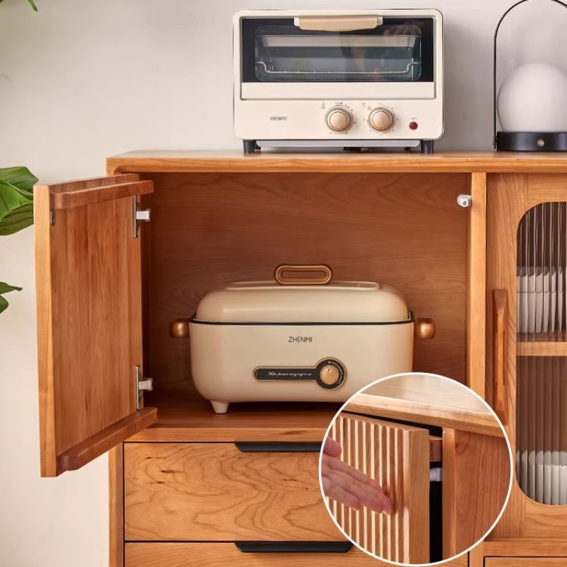 特点:选用北美FAS级进口樱桃木为材。这款樱桃木餐边柜设计贴心且实用。柜体高度适中,适应大多数人的使用习惯,减少了不必要的弯腰。柜门设计能够开合,有助于保持物品免受尘埃污染。而超宽的收纳抽屉提供了大量的储存空间,方便整理各种物品。此外,层板可调节,使您可以根据需求调整空间,为您的物品提供了更多摆放选择。这款餐边柜既实用又功能强大,为您的餐厅或客厅增添了实用性和风格。