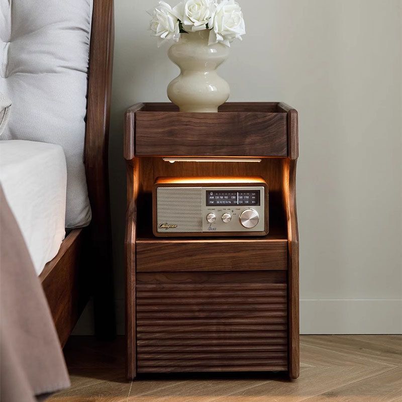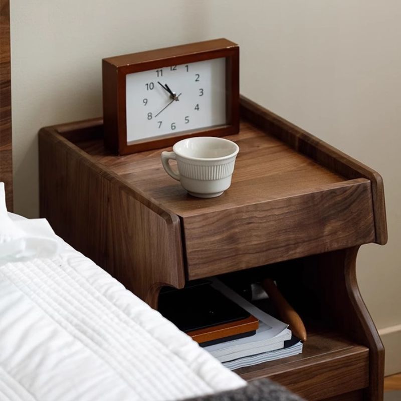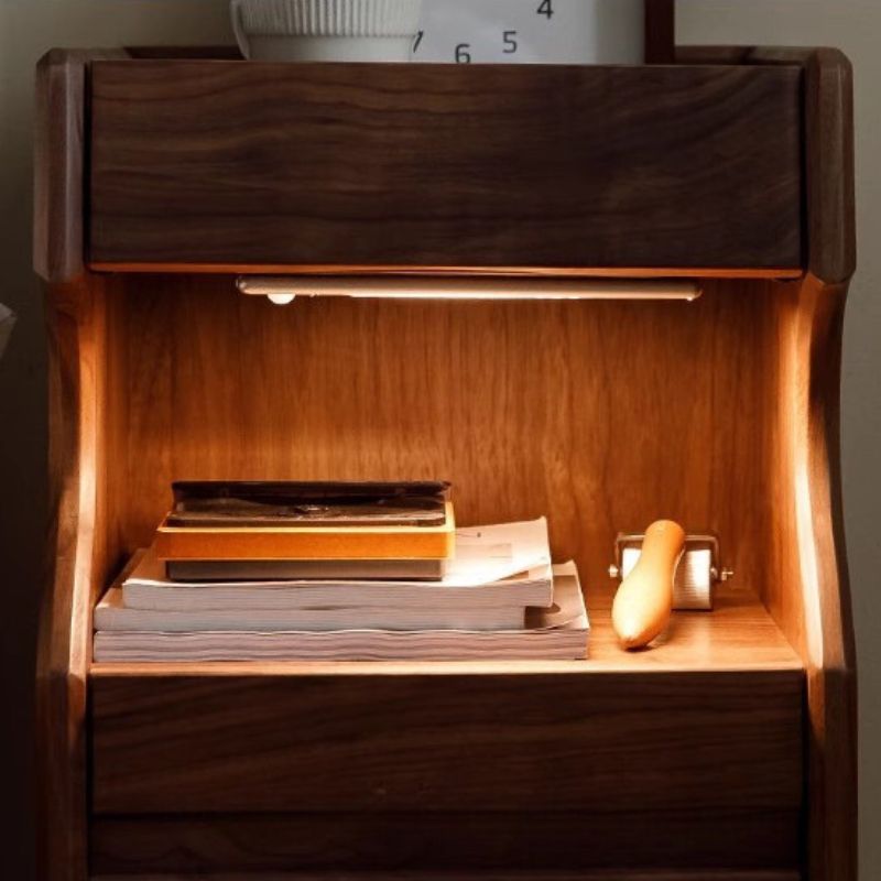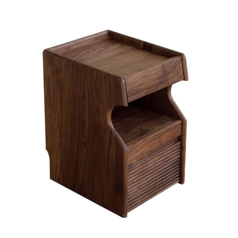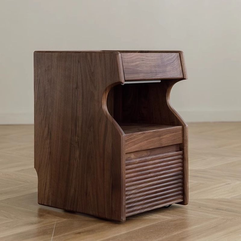 特點:選用北美進口黑胡桃木為材。這款床頭櫃設計時尚,帶有內置照明燈,方便夜間使用。配備靈活轆,移動輕鬆自如。窄身設計,適合小空間擺放,圓角增加安全性。開放式儲物空間,方便存取物品,並預留踢腳線,與牆面完美契合。