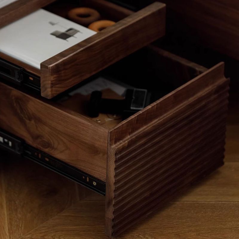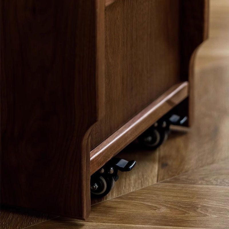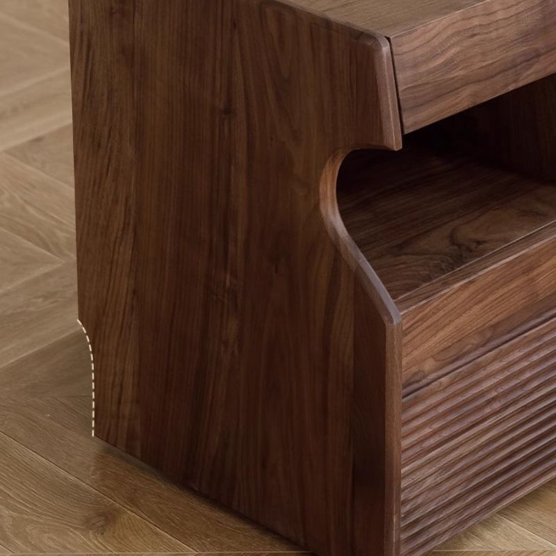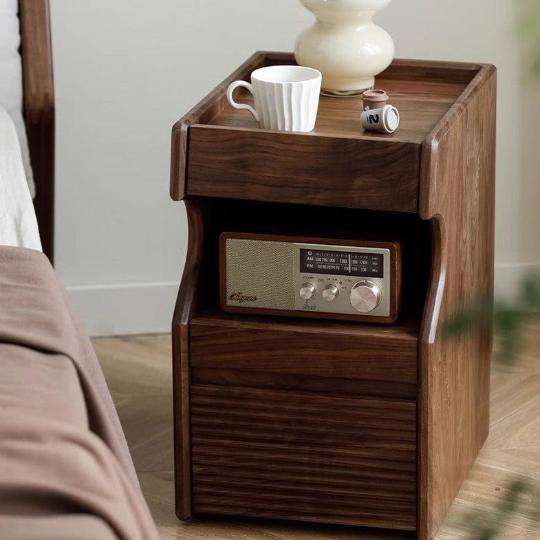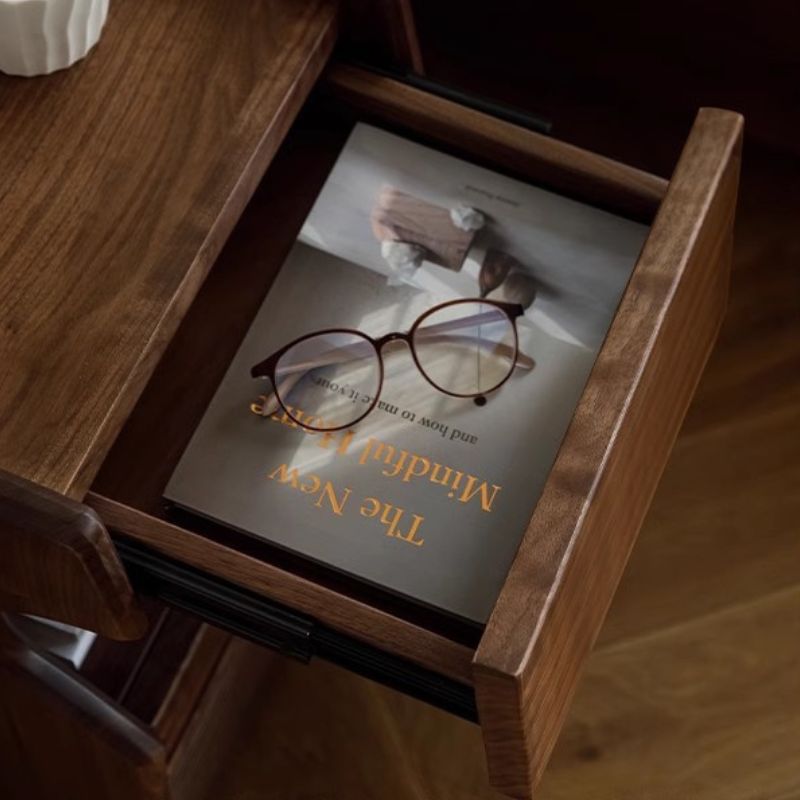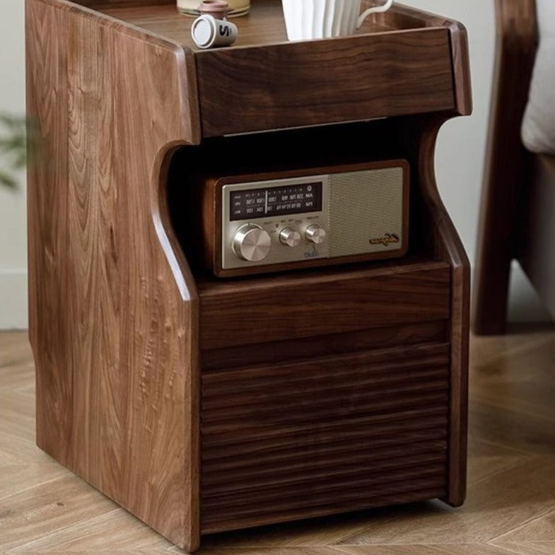 特點:選用北美進口黑胡桃木為材。這款床頭櫃設計時尚,帶有內置照明燈,方便夜間使用。配備靈活轆,移動輕鬆自如。窄身設計,適合小空間擺放,圓角增加安全性。開放式儲物空間,方便存取物品,並預留踢腳線,與牆面完美契合。